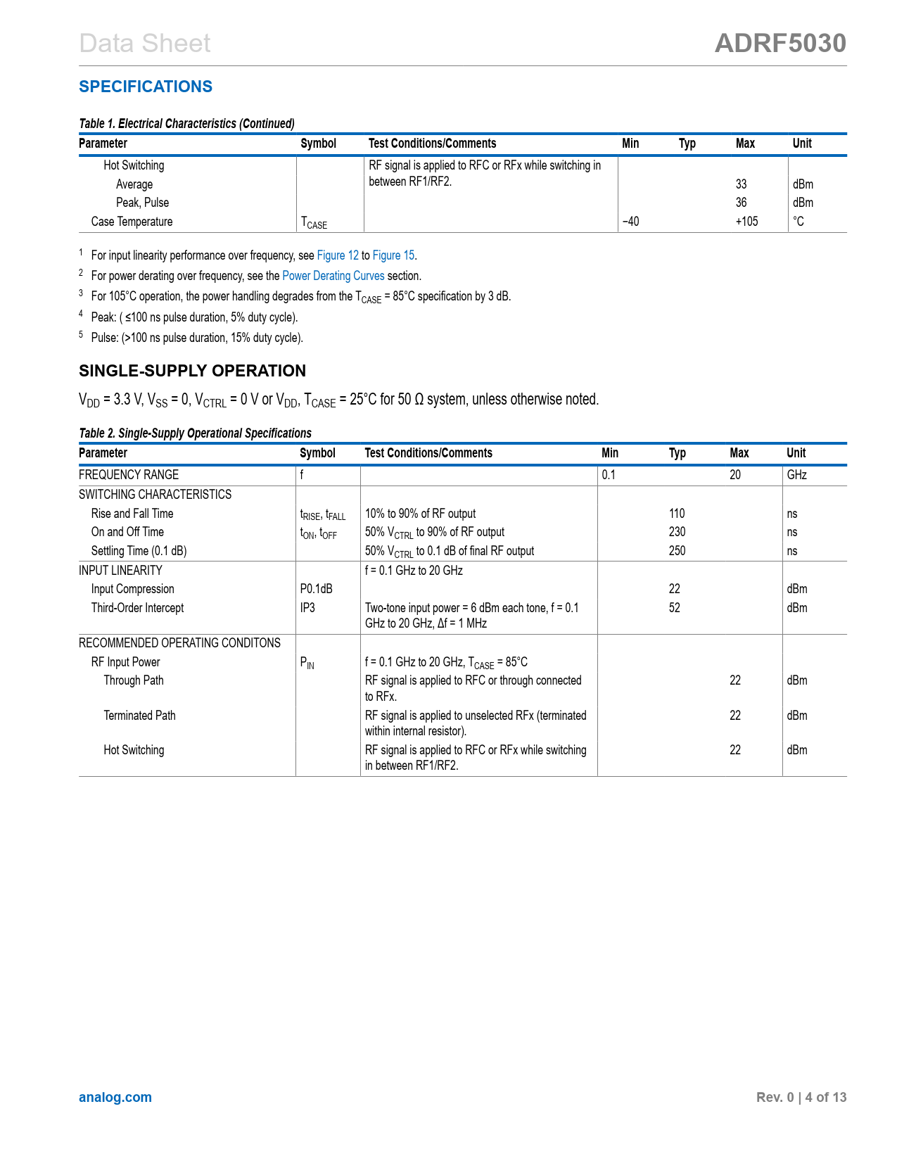 link to page 10 link to page 10 link to page 5 Data Sheet ADRF5030SPECIFICATIONSTable 1. Electrical Characteristics (Continued)ParameterSymbolTest Conditions/CommentsMinTypMaxUnit Hot Switching RF signal is applied to RFC or RFx while switching in Average between RF1/RF2. 33 dBm Peak, Pulse 36 dBm Case Temperature TCASE −40 +105 °C 1 For input linearity performance over frequency, see Figure 12 to Figure 15. 2 For power derating over frequency, see the Power Derating Curves section. 3 For 105°C operation, the power handling degrades from the TCASE = 85°C specification by 3 dB. 4 Peak: ( ≤100 ns pulse duration, 5% duty cycle). 5 Pulse: (>100 ns pulse duration, 15% duty cycle). SINGLE-SUPPLY OPERATION VDD = 3.3 V, VSS = 0, VCTRL = 0 V or VDD, TCASE = 25°C for 50 Ω system, unless otherwise noted. Table 2. Single-Supply Operational SpecificationsParameterSymbolTest Conditions/CommentsMinTypMaxUnit FREQUENCY RANGE f 0.1 20 GHz SWITCHING CHARACTERISTICS Rise and Fall Time tRISE, tFALL 10% to 90% of RF output 110 ns On and Off Time tON, tOFF 50% VCTRL to 90% of RF output 230 ns Settling Time (0.1 dB) 50% VCTRL to 0.1 dB of final RF output 250 ns INPUT LINEARITY f = 0.1 GHz to 20 GHz Input Compression P0.1dB 22 dBm Third-Order Intercept IP3 Two-tone input power = 6 dBm each tone, f = 0.1 52 dBm GHz to 20 GHz, Δf = 1 MHz RECOMMENDED OPERATING CONDITONS RF Input Power PIN f = 0.1 GHz to 20 GHz, TCASE = 85°C Through Path RF signal is applied to RFC or through connected 22 dBm to RFx. Terminated Path RF signal is applied to unselected RFx (terminated 22 dBm within internal resistor). Hot Switching RF signal is applied to RFC or RFx while switching 22 dBm in between RF1/RF2. analog.comRev. 0 | 4 of 13 Document Outline Features Applications Functional Block Diagram General Description Specifications Single-Supply Operation Absolute Maximum Ratings Thermal Resistance Power Derating Curves Electrostatic Discharge (ESD) Ratings ESD Ratings for the ADRF5030 ESD Caution Pin Configuration and Function Descriptions Interface Schematics Typical Performance Characteristics Insertion Loss, Return Loss, and Isolation Input Power Compression and Third-Order Intercept Theory of Operation RF Input and Output Power Supply Applications Information Recommendations for Printed Circuit Board Design Outline Dimensions Ordering Guide Notes