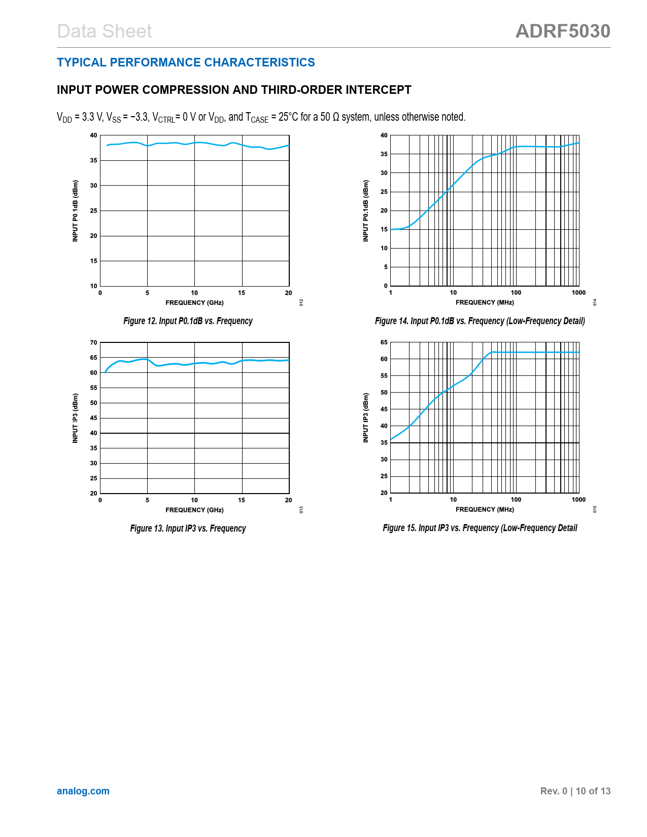Figure 12. Input P0.1dB vs. Frequency Figure 14. Input P0.1dB vs. Frequency (Low-Frequency Detail) Figure 13. Input IP3 vs. Frequency Figure 15. Input IP3 vs. Frequency (Low-Frequency Detail analog.com Rev. 0 | 10 of 13