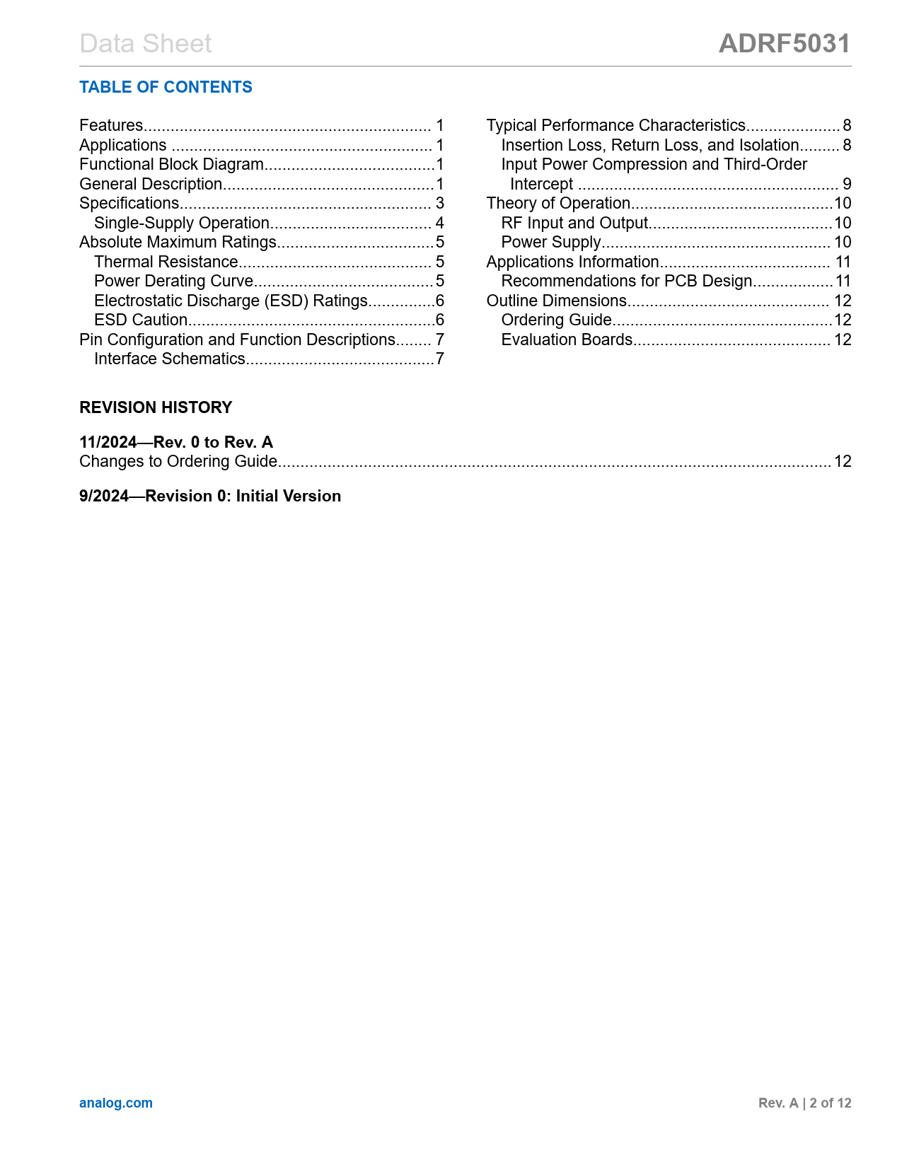 Páginas / Página12 / 2 — ADRF5031. TABLE OF CONTENTS. REVISION HISTORY. 11/2024—Rev. 0 to Rev. A. …