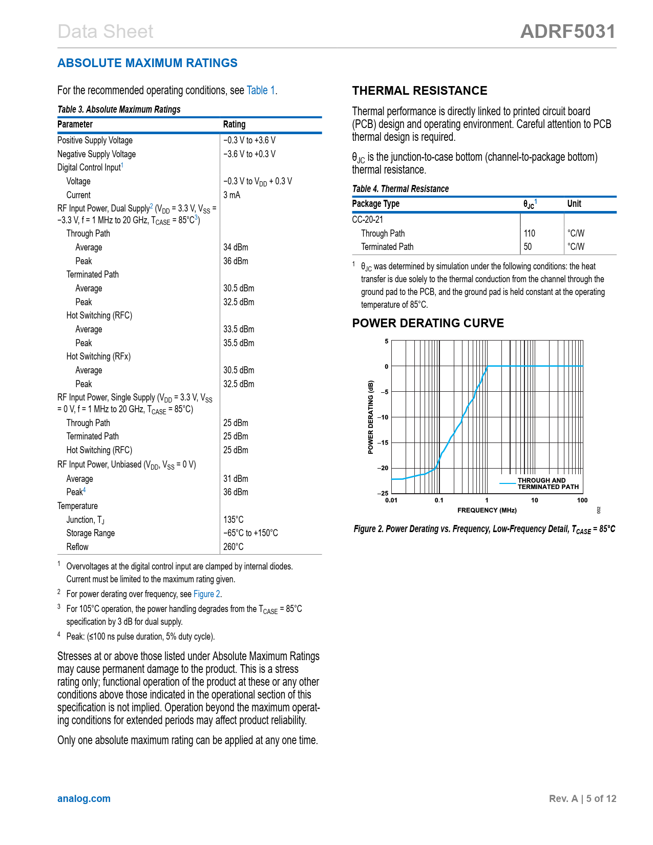 Páginas / Página12 / 5 — ADRF5031. ABSOLUTE MAXIMUM RATINGS. THERMAL RESISTANCE. Table 3. Absolute …