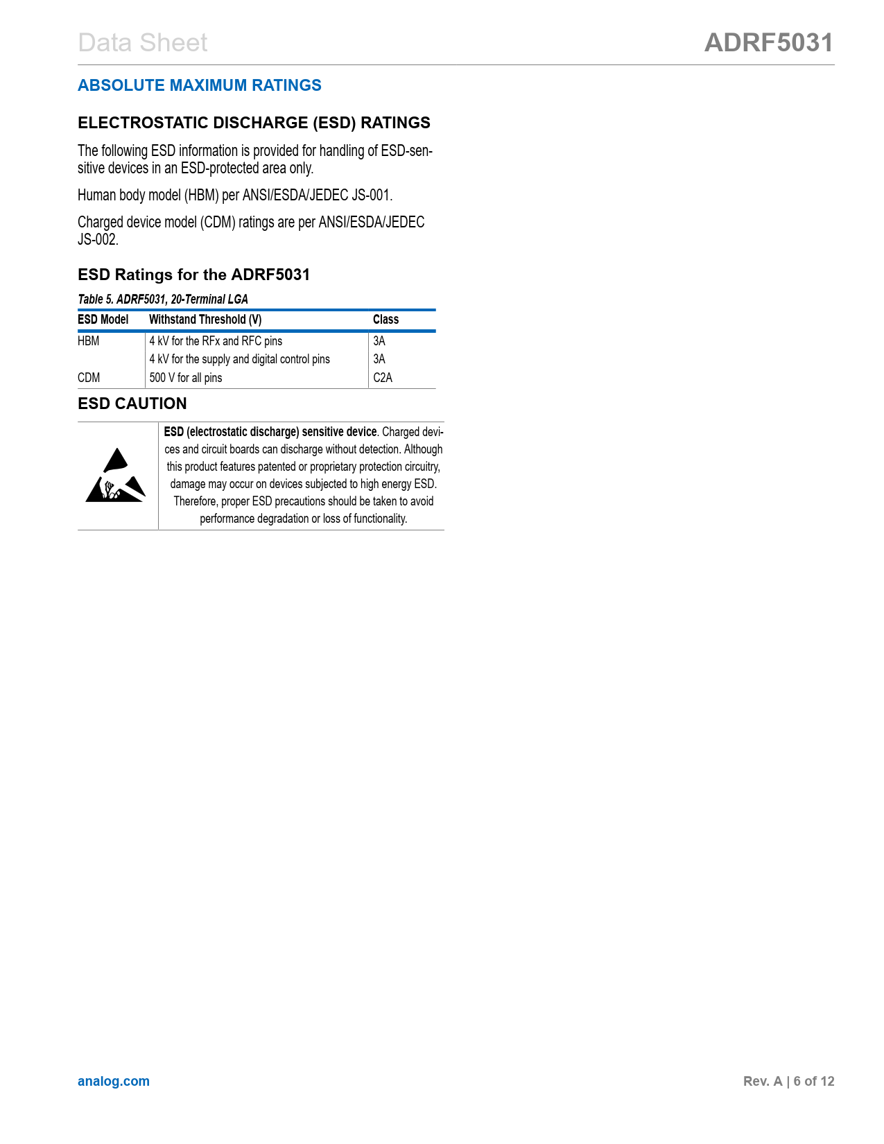 Páginas / Página12 / 6 — ADRF5031. ABSOLUTE MAXIMUM RATINGS. ELECTROSTATIC DISCHARGE (ESD) RATINGS