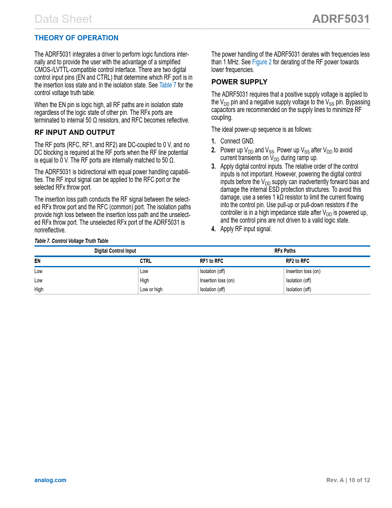 link to page 10 link to page 5 Data Sheet ADRF5031THEORY OF OPERATION The ADRF5031 integrates a driver to perform logic functions inter- The power handling of the ADRF5031 derates with frequencies less nally and to provide the user with the advantage of a simplified than 1 MHz. See Figure 2 for derating of the RF power towards CMOS-/LVTTL-compatible control interface. There are two digital lower frequencies. control input pins (EN and CTRL) that determine which RF port is in the insertion loss state and in the isolation state. See Table 7 for the POWER SUPPLY control voltage truth table. The ADRF5031 requires that a positive supply voltage is applied to When the EN pin is logic high, all RF paths are in isolation state the VDD pin and a negative supply voltage to the VSS pin. Bypassing regardless of the logic state of other pin. The RFx ports are capacitors are recommended on the supply lines to minimize RF terminated to internal 50 Ω resistors, and RFC becomes reflective. coupling. RF INPUT AND OUTPUT The ideal power-up sequence is as follows: The RF ports (RFC, RF1, and RF2) are DC-coupled to 0 V, and no 1. Connect GND. DC blocking is required at the RF ports when the RF line potential 2. Power up VDD and VSS. Power up VSS after VDD to avoid is equal to 0 V. The RF ports are internally matched to 50 Ω. current transients on VDD during ramp up. 3. Apply digital control inputs. The relative order of the control The ADRF5031 is bidirectional with equal power handling capabili- inputs is not important. However, powering the digital control ties. The RF input signal can be applied to the RFC port or the inputs before the V selected RFx throw port. DD supply can inadvertently forward bias and damage the internal ESD protection structures. To avoid this The insertion loss path conducts the RF signal between the select- damage, use a series 1 kΩ resistor to limit the current flowing ed RFx throw port and the RFC (common) port. The isolation paths into the control pin. Use pull-up or pull-down resistors if the provide high loss between the insertion loss path and the unselect- controller is in a high impedance state after VDD is powered up, ed RFx throw port. The unselected RFx port of the ADRF5031 is and the control pins are not driven to a valid logic state. nonreflective. 4. Apply RF input signal. Table 7. Control Voltage Truth TableDigital Control InputRFx PathsENCTRLRF1 to RFCRF2 to RFC Low Low Isolation (off) Insertion loss (on) Low High Insertion loss (on) Isolation (off) High Low or high Isolation (off) Isolation (off) analog.comRev. A | 10 of 12 Document Outline Features Applications Functional Block Diagram General Description Specifications Single-Supply Operation Absolute Maximum Ratings Thermal Resistance Power Derating Curve Electrostatic Discharge (ESD) Ratings ESD Ratings for the ADRF5031 ESD Caution Pin Configuration and Function Descriptions Interface Schematics Typical Performance Characteristics Insertion Loss, Return Loss, and Isolation Input Power Compression and Third-Order Intercept Theory of Operation RF Input and Output Power Supply Applications Information Recommendations for PCB Design Outline Dimensions Ordering Guide Evaluation Boards