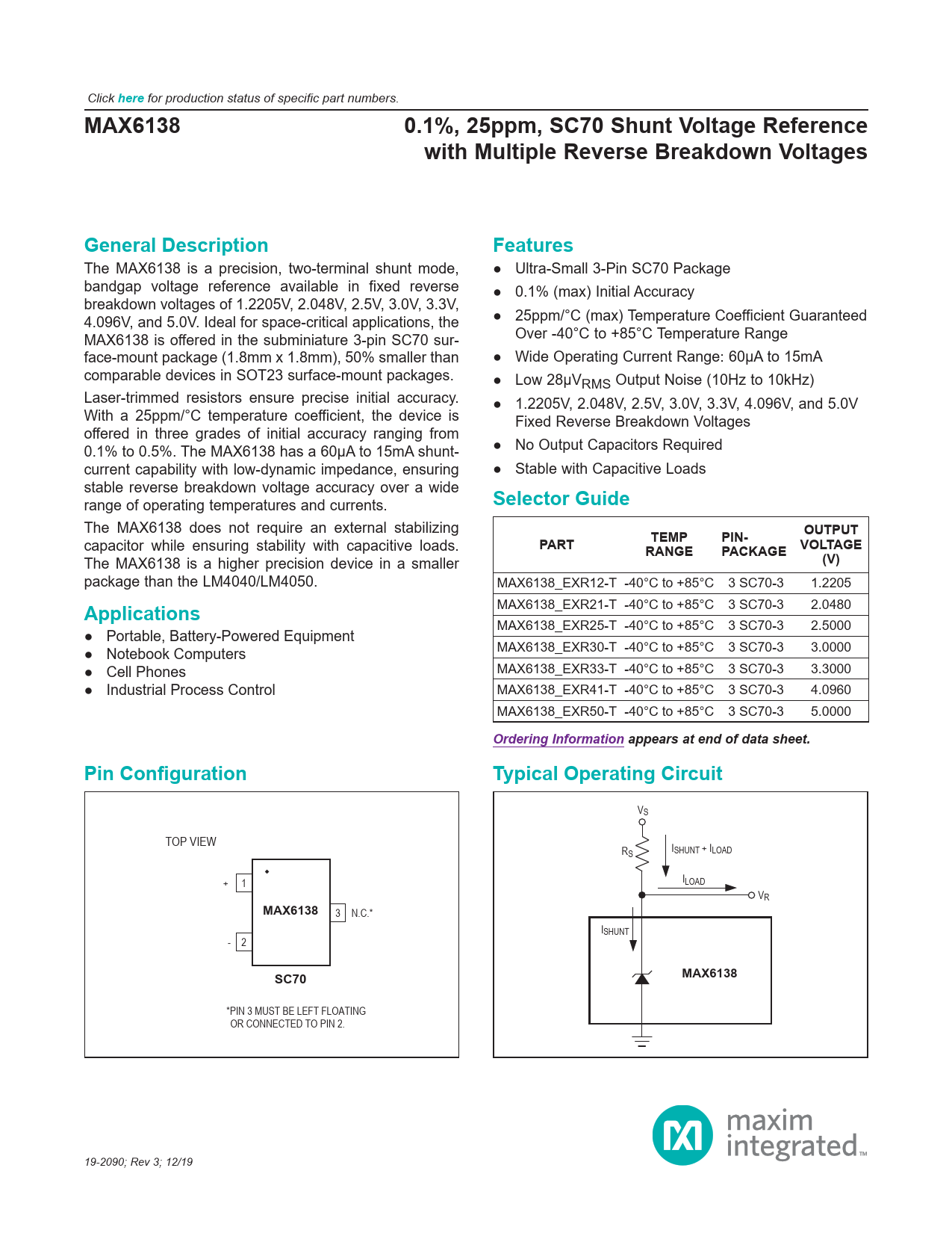 link to page 12 Click here for production status of specific part numbers. MAX61380.1%, 25ppm, SC70 Shunt Voltage Referencewith Multiple Reverse Breakdown VoltagesGeneral DescriptionFeatures The MAX6138 is a precision, two-terminal shunt mode, ● Ultra-Small 3-Pin SC70 Package bandgap voltage reference available in fixed reverse ● 0.1% (max) Initial Accuracy breakdown voltages of 1.2205V, 2.048V, 2.5V, 3.0V, 3.3V, 4.096V, and 5.0V. Ideal for space-critical applications, the ● 25ppm/°C (max) Temperature Coefficient Guaranteed MAX6138 is offered in the subminiature 3-pin SC70 sur- Over -40°C to +85°C Temperature Range face-mount package (1.8mm x 1.8mm), 50% smaller than ● Wide Operating Current Range: 60μA to 15mA comparable devices in SOT23 surface-mount packages. ● Low 28μVRMS Output Noise (10Hz to 10kHz) Laser-trimmed resistors ensure precise initial accuracy. ● 1.2205V, 2.048V, 2.5V, 3.0V, 3.3V, 4.096V, and 5.0V With a 25ppm/°C temperature coefficient, the device is Fixed Reverse Breakdown Voltages offered in three grades of initial accuracy ranging from 0.1% to 0.5%. The MAX6138 has a 60μA to 15mA shunt- ● No Output Capacitors Required current capability with low-dynamic impedance, ensuring ● Stable with Capacitive Loads stable reverse breakdown voltage accuracy over a wide range of operating temperatures and currents. Selector Guide The MAX6138 does not require an external stabilizing OUTPUT capacitor while ensuring stability with capacitive loads. PARTTEMPPIN-RANGEPACKAGE VOLTAGE The MAX6138 is a higher precision device in a smaller (V) package than the LM4040/LM4050. MAX6138_EXR12-T -40°C to +85°C 3 SC70-3 1.2205 Applications MAX6138_EXR21-T -40°C to +85°C 3 SC70-3 2.0480 MAX6138_EXR25-T -40°C to +85°C 3 SC70-3 2.5000 ● Portable, Battery-Powered Equipment ● Notebook Computers MAX6138_EXR30-T -40°C to +85°C 3 SC70-3 3.0000 ● Cell Phones MAX6138_EXR33-T -40°C to +85°C 3 SC70-3 3.3000 ● Industrial Process Control MAX6138_EXR41-T -40°C to +85°C 3 SC70-3 4.0960 MAX6138_EXR50-T -40°C to +85°C 3 SC70-3 5.0000 Ordering Information appears at end of data sheet.Pin ConfigurationTypical Operating Circuit VS TOP VIEW RS ISHUNT + ILOAD ILOAD + 1 VR MAX6138 3 N.C.* ISHUNT - 2 MAX6138SC70 *PIN 3 MUST BE LEFT FLOATING OR CONNECTED TO PIN 2. 19-2090; Rev 3; 12/19