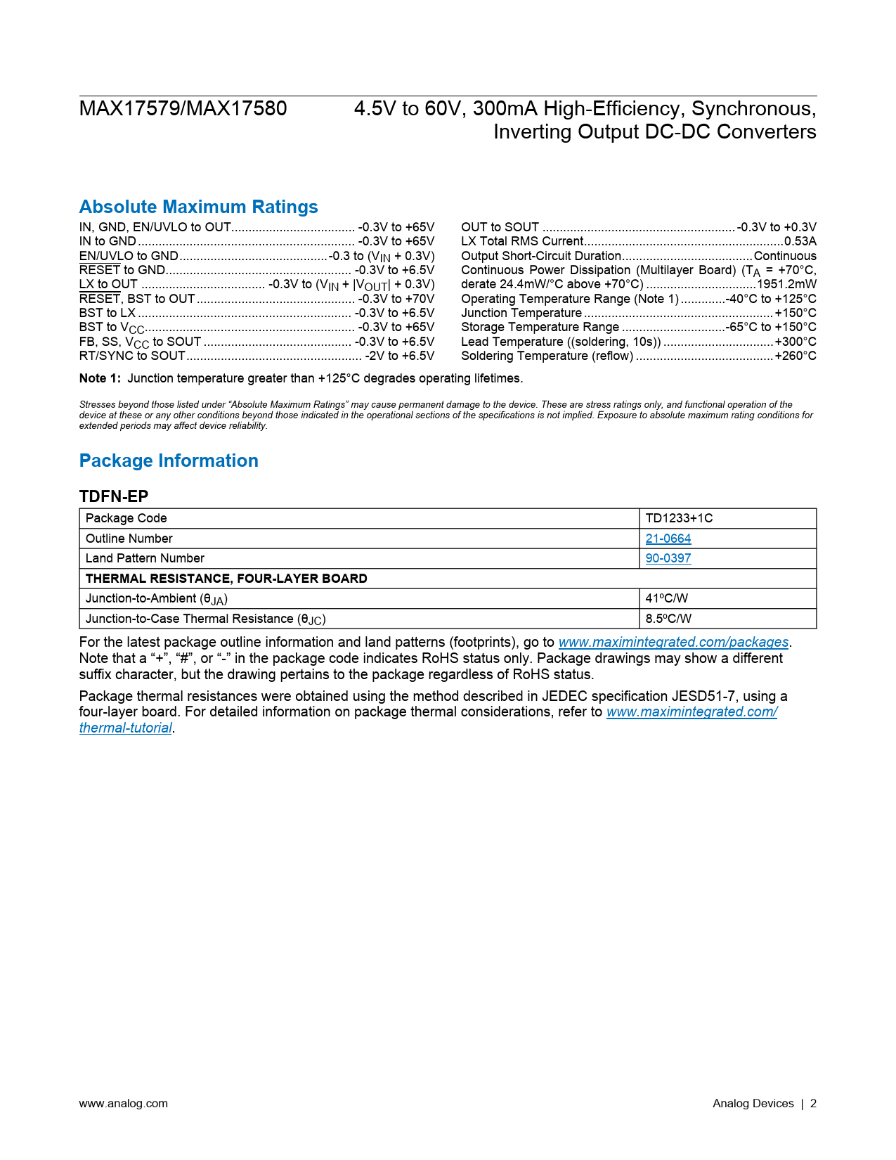 Absolute Maximum Ratings. Note 1:. Package Information. TDFN-EP. THERMAL RESISTANCE, FOUR-LAYER BOARD