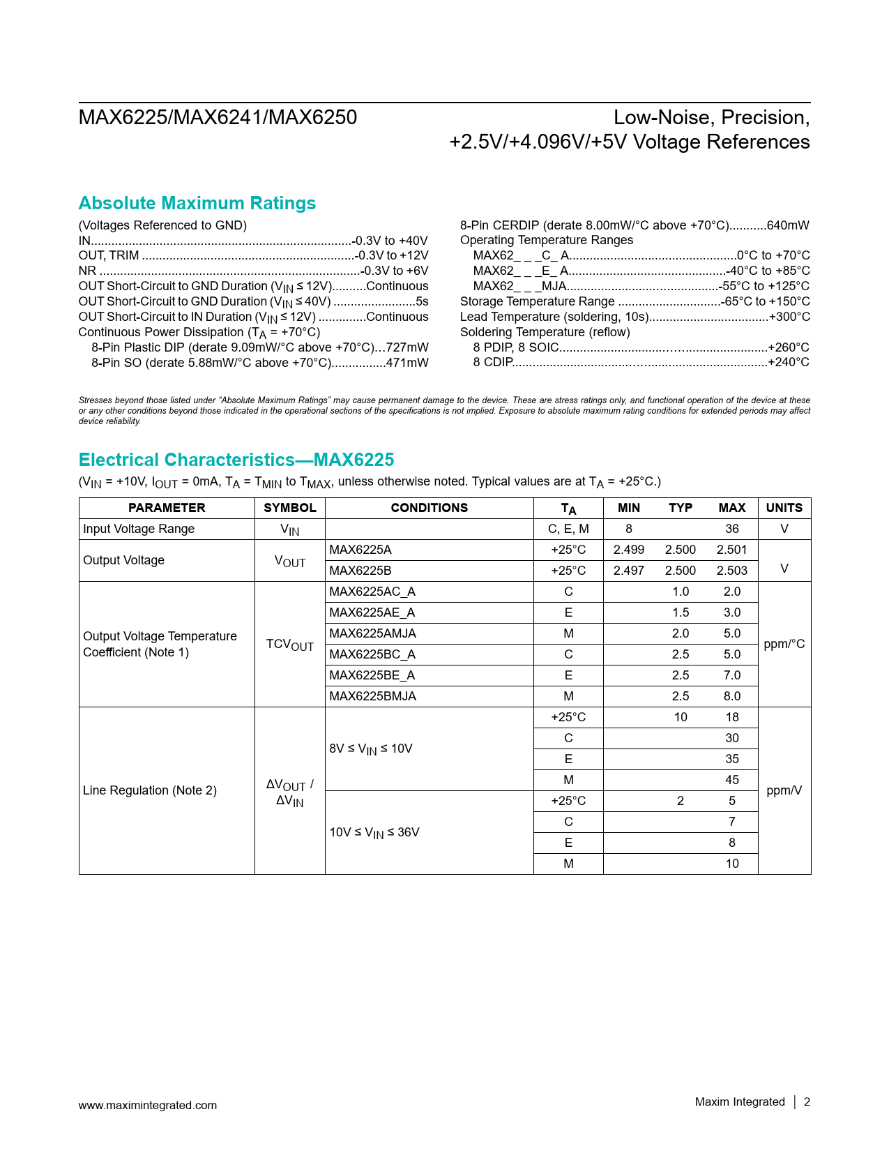 Absolute Maximum Ratings. Electrical Characteristics—MAX6225. PARAMETER. SYMBOL. CONDITIONS. MIN. TYP. MAX. UNITS