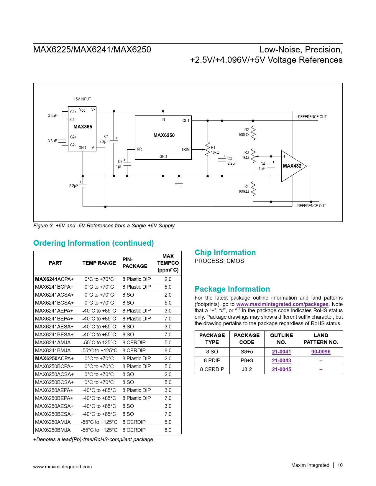 MAX865. MAX6250. MAX432. Ordering Information (continued). Chip Information. MAX. PART. TEMP RANGE PIN-. PACKAGE. TEMPCO. (ppm/°C). MAX6241