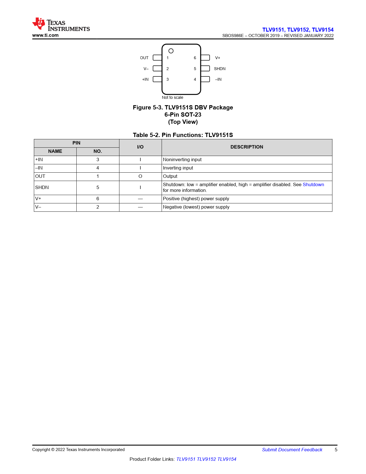 Figure 5-3. TLV9151S DBV Package 6-Pin SOT-23 (Top View) Table 5-2. Pin Functions: TLV9151S PIN I/O DESCRIPTION NAME NO.