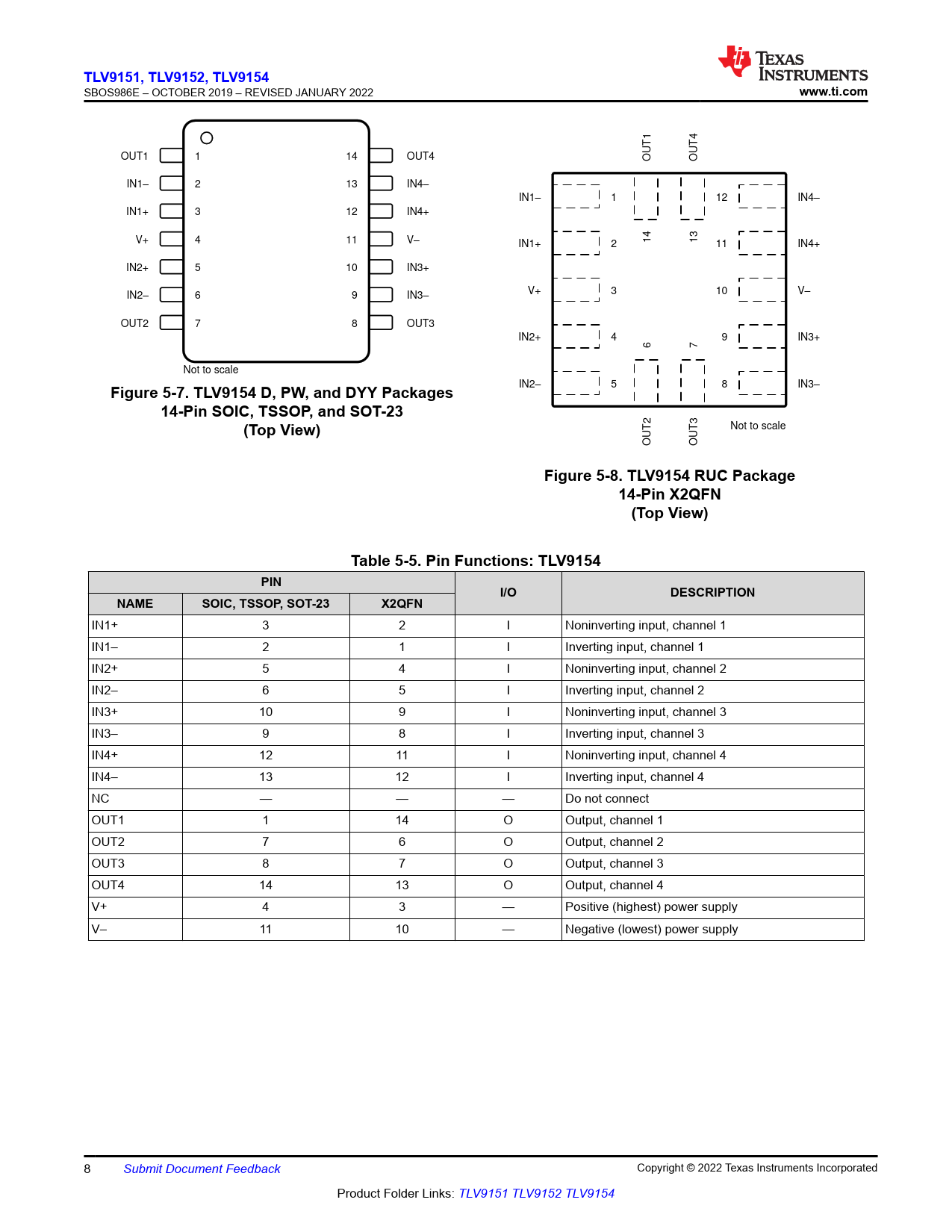 TLV9151, TL. V9152,. TLV9154. www.ti.com. Figure 5-7. TLV9154 D, PW, and DYY Packages. 14-Pin SOIC, TSSOP, and SOT-23. (Top View)