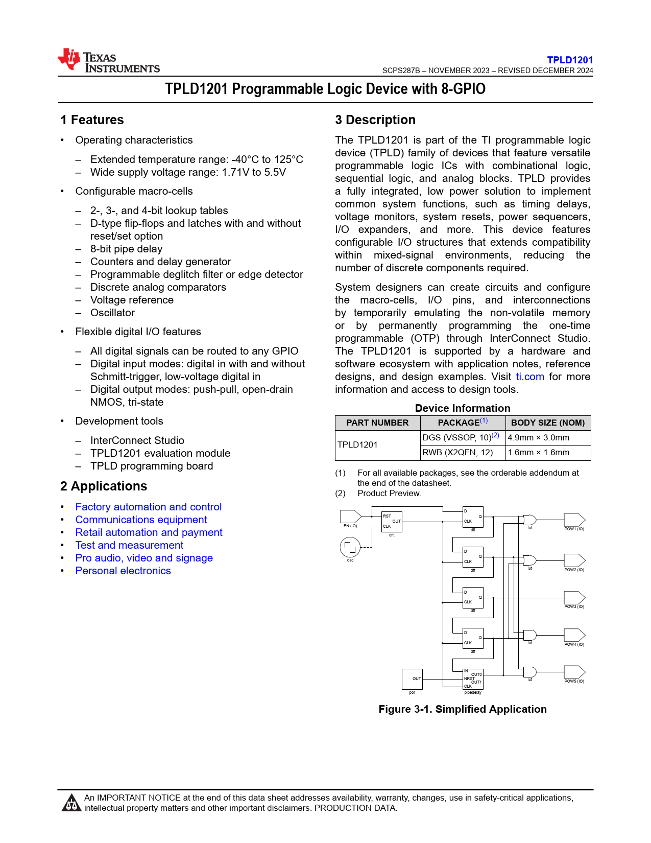 TPLD1201. TPLD1201 Programmable Logic Device with 8-GPIO. 1 Features. 3 Description. Device Information. PART NUMBER. PACKAGE