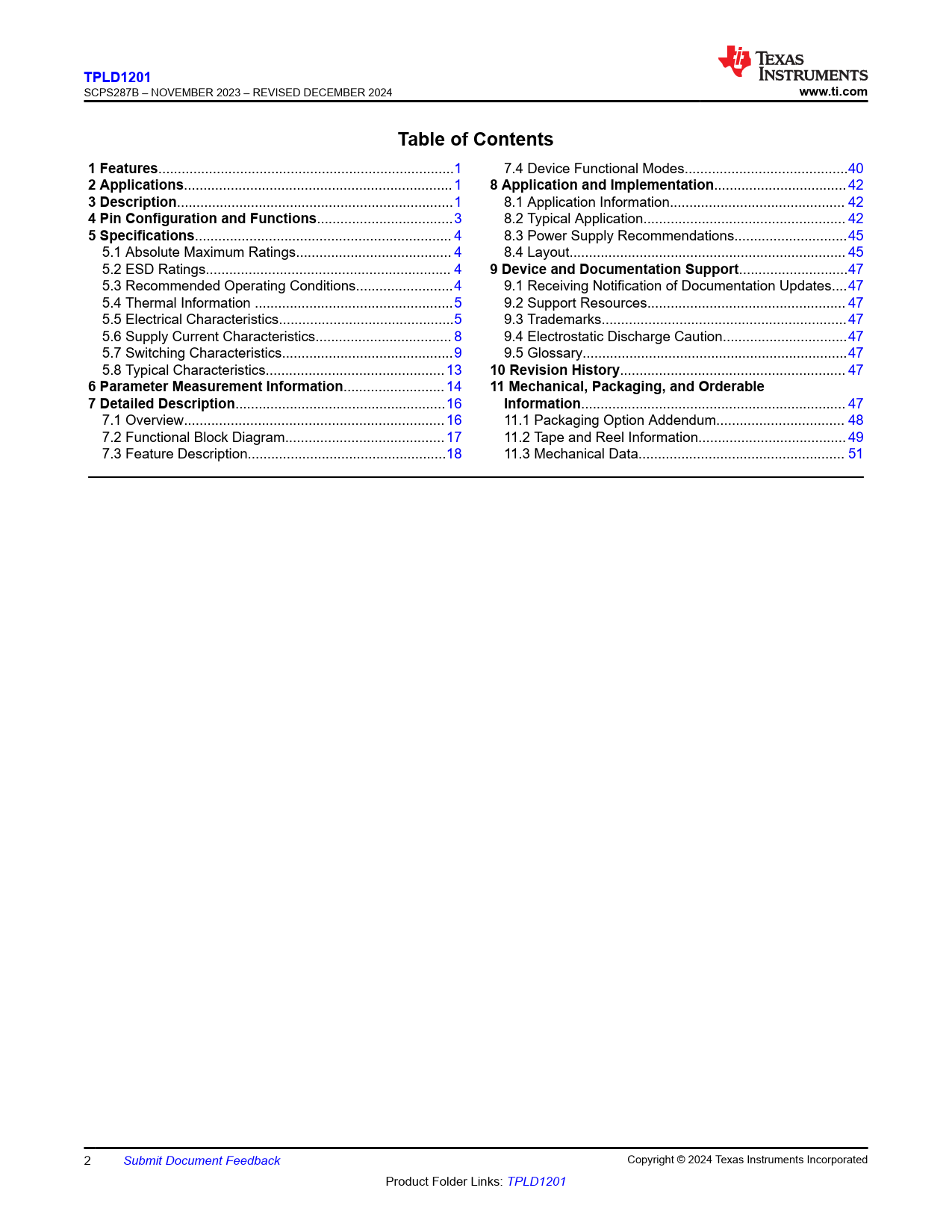 | Páginas / Página | 67 / 2 — TPLD1201. www.ti.com. Table of Contents. 1 Features. 2 Applications. 8 … |