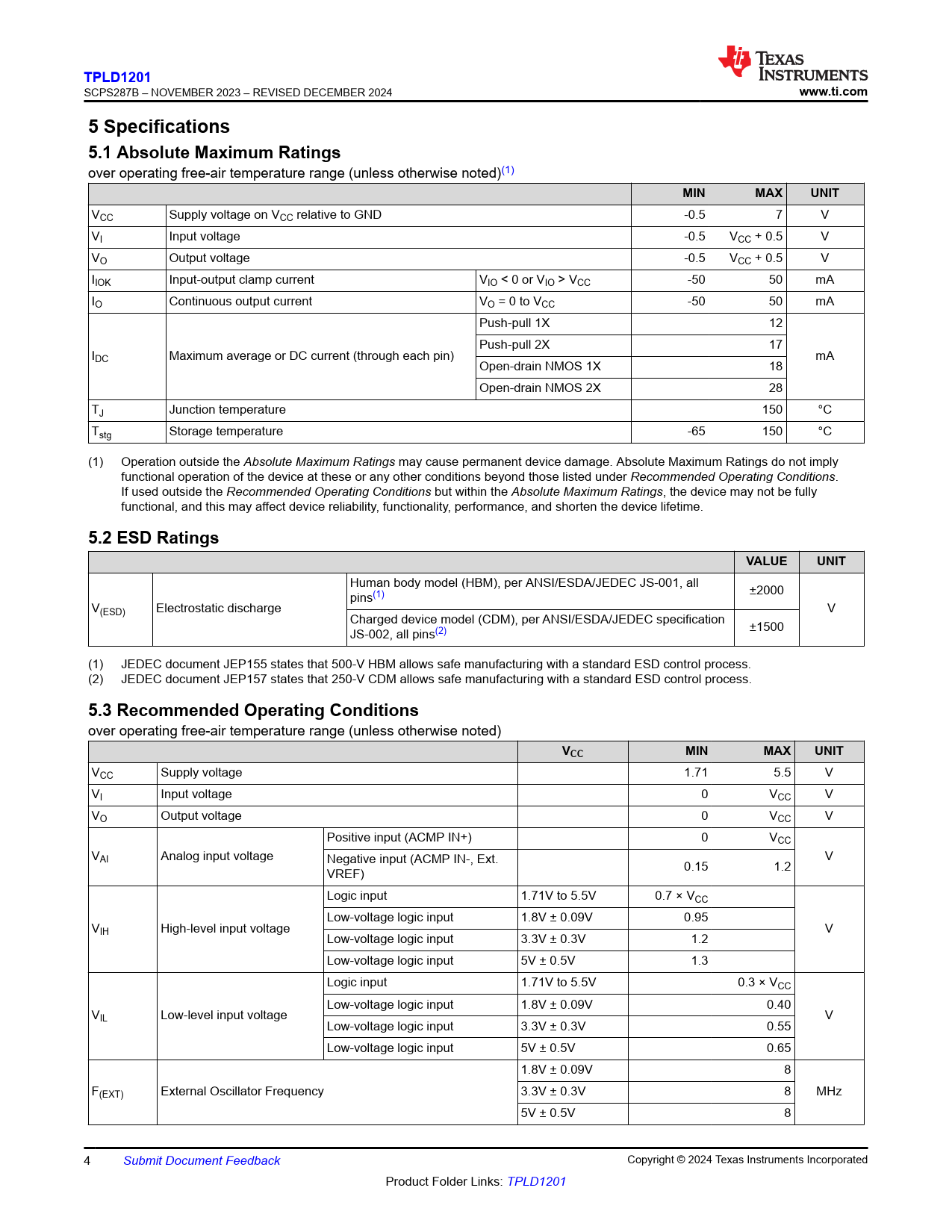 TPLD1201. www.ti.com. 5 Specifications 5.1 Absolute Maximum Ratings. MIN. MAX. UNIT. 5.2 ESD Ratings. VALUE