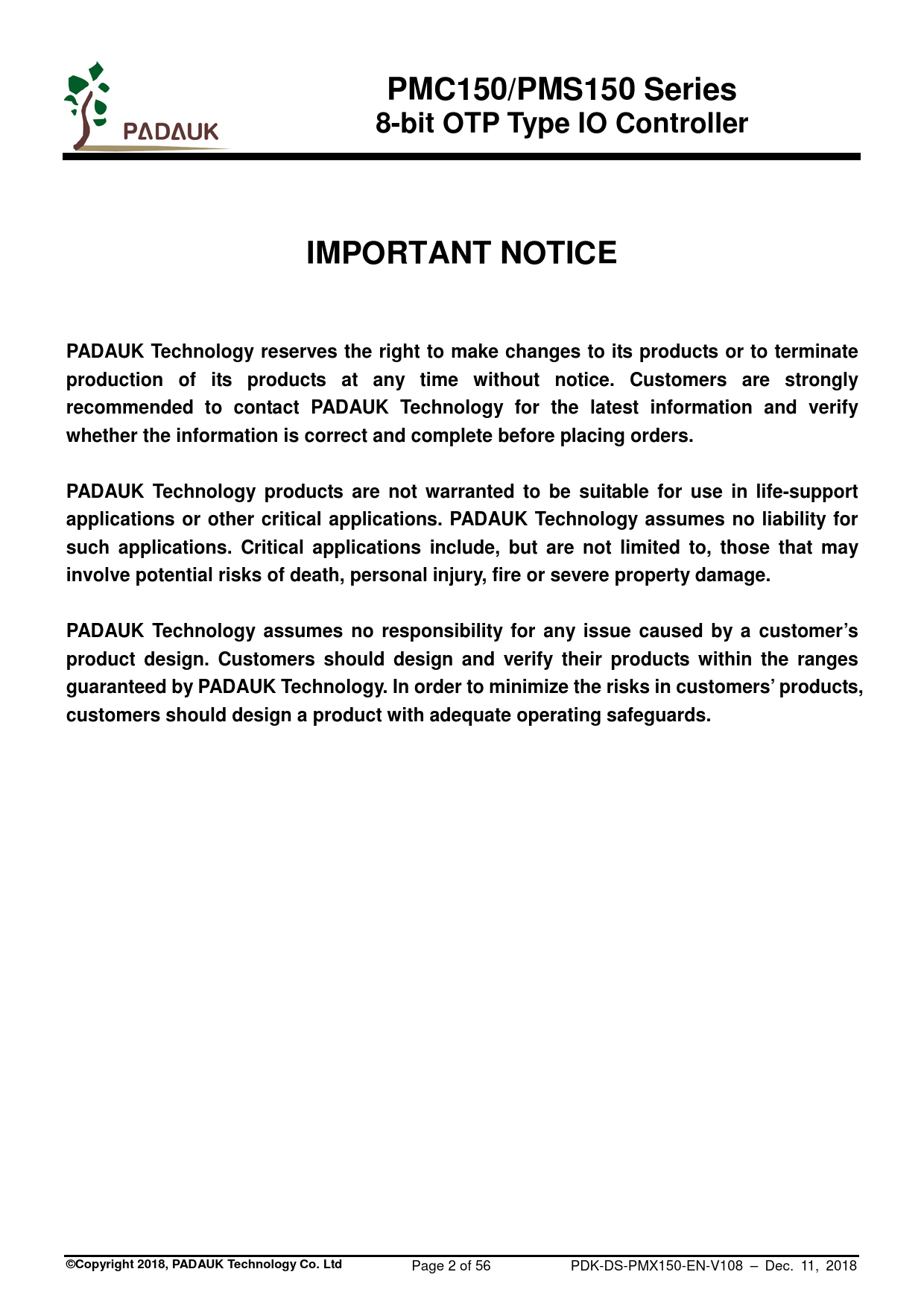 customers should design a product with adequate operating safeguards. ©Copyright 2018, PADAUK Technology Co. Ltd Page 2 of 56 PDK-DS-PMX150-EN-V108 – Dec. 11, 2018