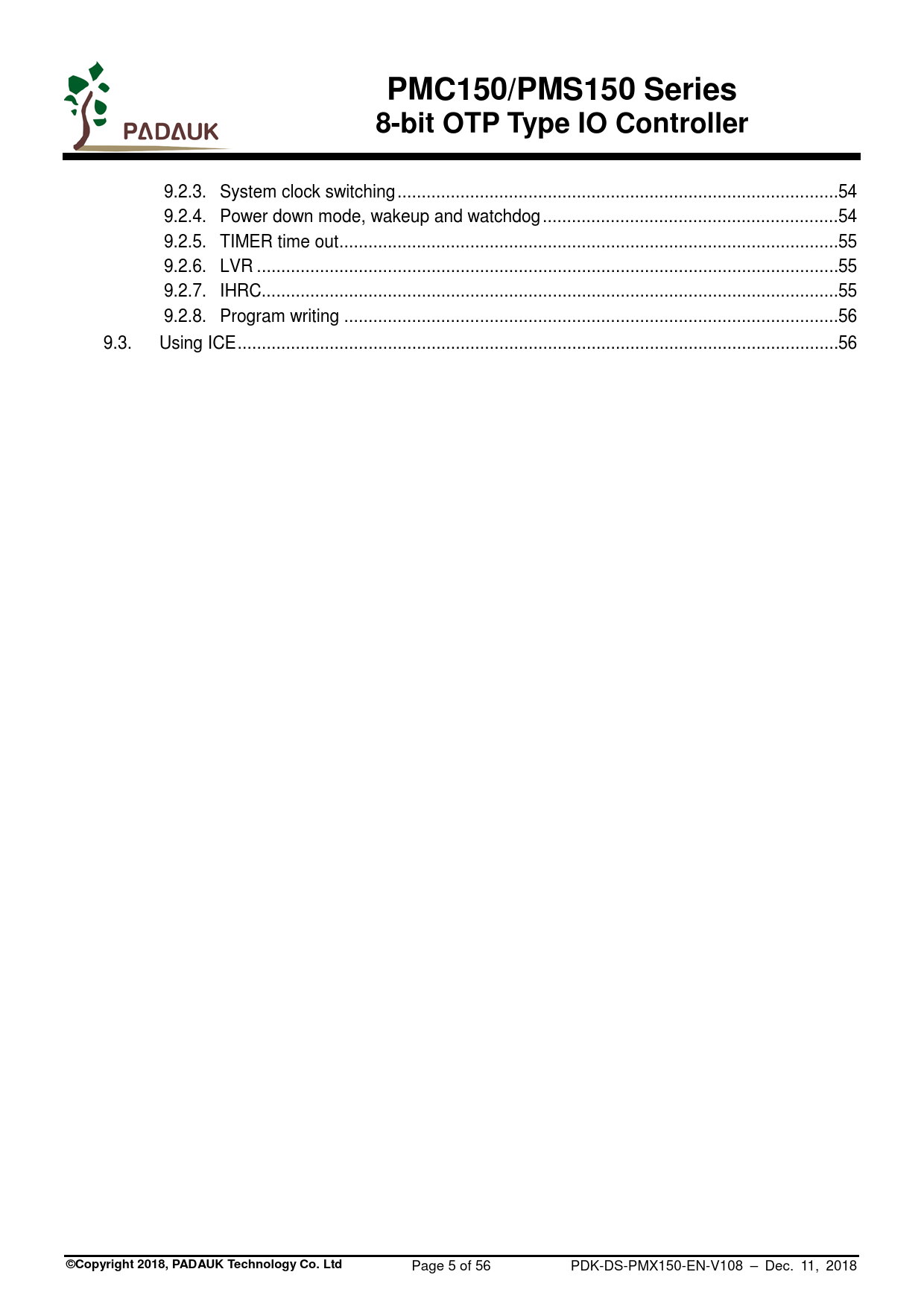 Program writing .56 Using ICE .56 ©Copyright 2018, PADAUK Technology Co. Ltd Page 5 of 56 PDK-DS-PMX150-EN-V108 – Dec. 11, 2018
