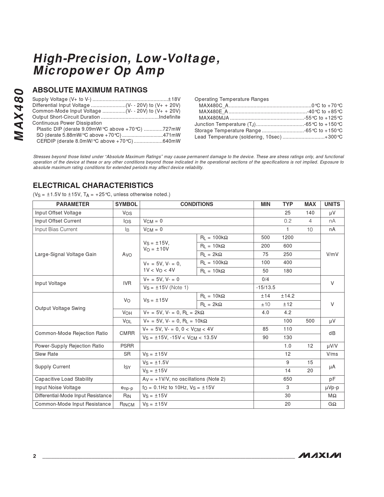 High-Precision, Low-Voltage, Micropower Op AmpABSOLUTE MAXIMUM RATINGS Supply Voltage (V+ to V-) ..±18V Operating Temperature Ranges Differential Input Voltage ..(V- - 20V) to (V+ + 20V) MAX480C_A...0°C to +70°C Common-Mode Input Voltage ..(V- - 20V) to (V+ + 20V) MAX480E_A ..-40°C to +85°C Output Short-Circuit Duration ..Indefinite MAX480MJA ...-55°C to +125°C Continuous Power Dissipation Junction Temperature (TJ)...-65°C to +150°C Plastic DIP (derate 9.09mW/°C above +70°C) ...727mW Storage Temperature Range ...-65°C to +150°C MAX480 SO (derate 5.88mW/°C above +70°C) ..471mW Lead Temperature (soldering, 10sec) ...+300°C CERDIP (derate 8.0mW/°C above +70°C) ..640mW Stresses beyond those listed under “Absolute Maximum Ratings” may cause permanent damage to the device. These are stress ratings only, and functional operation of the device at these or any other conditions beyond those indicated in the operational sections of the specifications is not implied. Exposure to absolute maximum rating conditions for extended periods may affect device reliability. ELECTRICAL CHARACTERISTICS (VS = ±1.5V to ±15V, TA = +25°C, unless otherwise noted.) PARAMETERSYMBOLCONDITIONSMINTYPMAXUNITS Input Offset Voltage VOS 25 140 µV Input Offset Current IOS VCM = 0 0.2 4 nA Input Bias Current IB VCM = 0 1 3 10 nA RL = 100kΩ 500 1200 VS = ±15V, R 200 600 V L = 10kΩ O = ±10V Large-Signal Voltage Gain AVO RL = 2kΩ 75 250 V/mV R V+ = 5V, V- = 0, L = 100kΩ 100 400 1V < VO < 4V RL = 10kΩ 50 180 V+ = 5V, V- = 0 0/4 Input Voltage IVR V VS = ±15V (Note 1) -15/13.5 RL = 10kΩ ±14 ±14.2 VO VS = ±15V RL = 2kΩ ±10 ±12 V Output Voltage Swing VOH V+ = 5V, V- = 0, RL = 2kΩ 4.0 4.2 VOL V+ = 5V, V- = 0, RL = 10kΩ 100 500 µV V+ = 5V, V- = 0, 0 < VCM < 4V 85 110 Common-Mode Rejection Ratio CMRR dB VS = ±15V, -15V < VCM < 13.5V 90 130 Power-Supply Rejection Ratio PSRR 1.0 12 µV/V Slew Rate SR VS = ±15V 5 12 V/ms VS = ±1.5V 9 15 Supply Current ISY µA VS = ±15V 14 20 Capacitive Load Stability AV = +1V/V, no oscillations (Note 2) 250 650 pF Input Noise Voltage enp-p fO = 0.1Hz to 10Hz, VS = ±15V 3 µVp-p Differential-Mode Input Resistance RIN VS = ±15V 30 MΩ Common-Mode Input Resistance RINCM VS = ±15V 20 GΩ 2_______________________________________________________________________________________