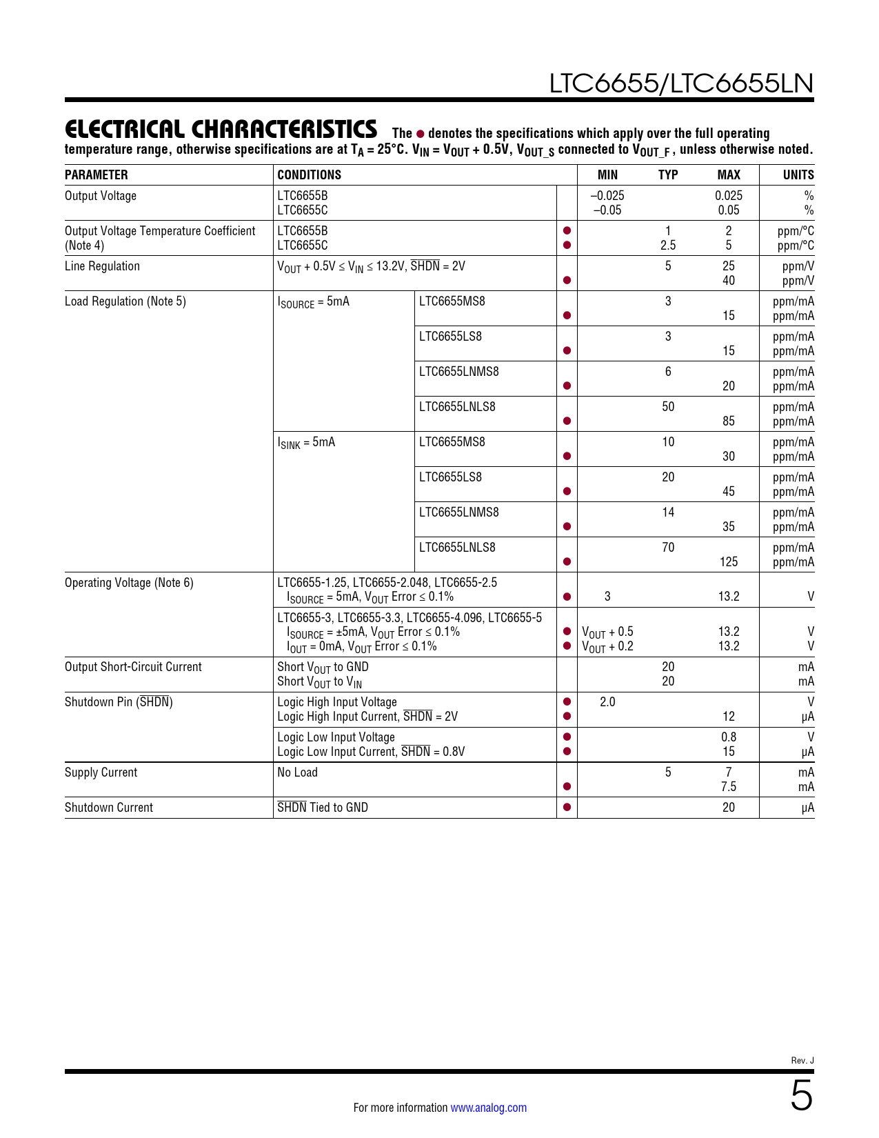 Output Voltage LTC6655B –0.025 0.025 % LTC6655C –0.05 0.05 % Output Voltage Temperature Coefficient LTC6655B l 1 2 ppm/°C (Note 4) LTC6655C l 2.5 5 ppm/°C Line Regulation VOUT + 0.5V ≤ VIN ≤ 13.2V, SHDN = 2V 5 25 ppm/V l 40 ppm/V Load Regulation (Note 5) ISOURCE = 5mA LTC6655MS8 3 ppm/mA l 15 ppm/mA LTC6655LS8 3 ppm/mA l 15 ppm/mA LTC6655LNMS8 6 ppm/mA l 20 ppm/mA LTC6655LNLS8 50 ppm/mA l 85 ppm/mA ISINK = 5mA LTC6655MS8 10 ppm/mA l 30 ppm/mA LTC6655LS8 20 ppm/mA l 45 ppm/mA LTC6655LNMS8 14 ppm/mA l 35 ppm/mA LTC6655LNLS8 70 ppm/mA l 125 ppm/mA Operating Voltage (Note 6) LTC6655-1.25, LTC6655-2.048, LTC6655-2.5 ISOURCE = 5mA, VOUT Error ≤ 0.1% l 3 13.2 V LTC6655-3, LTC6655-3.3, LTC6655-4.096, LTC6655-5 ISOURCE = ±5mA, VOUT Error ≤ 0.1% l VOUT + 0.5 13.2 V IOUT = 0mA, VOUT Error ≤ 0.1% l VOUT + 0.2 13.2 V Output Short-Circuit Current Short VOUT to GND 20 mA Short VOUT to VIN 20 mA Shutdown Pin (SHDN) Logic High Input Voltage l 2.0 V Logic High Input Current, SHDN = 2V l 12 µA Logic Low Input Voltage l 0.8 V Logic Low Input Current, SHDN = 0.8V l 15 µA Supply Current No Load 5 7 mA l 7.5 mA Shutdown Current SHDN Tied to GND l 20 µA Rev. J For more information www.analog.com 5 Document Outline Features Applications Typical Application Description Absolute Maximum Ratings Pin Configuration Order Information Available Options Electrical Characteristics Typical Performance Characteristics Pin Functions Block Diagram Applications Information Typical Applications Package Description Revision History Typical Application Related Parts