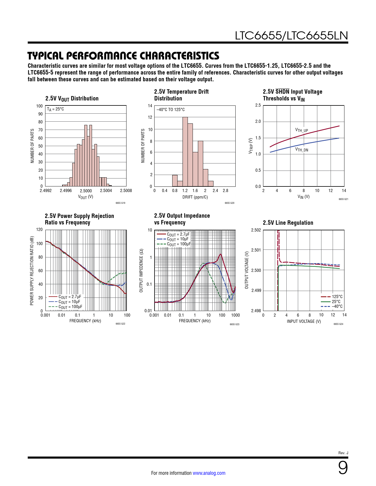 TYPICAL PERFORMANCE CHARACTERISTICS Characteristic curves are similar for most voltage options of the LTC6655. Curves from the LTC6655-1.25, LTC6655-2.5 and the LTC6655-5 represent the range of performance across the entire family of references. Characteristic curves for other output voltages fall between these curves and can be estimated based on their voltage output. 2.5V Temperature Drift 2.5V SHDN Input Voltage 2.5V VOUT Distribution Distribution Thresholds vs VIN