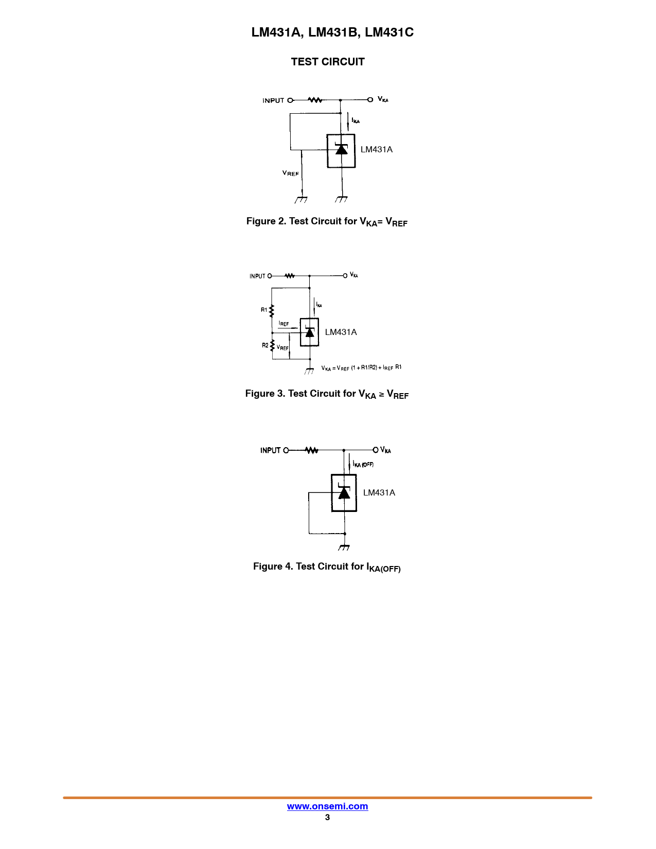 LM431A, LM431B, LM431C. TEST CIRCUIT. Figure 2. Test Circuit for VKA= VREF. Figure 3. Test Circuit for VKA. VREF