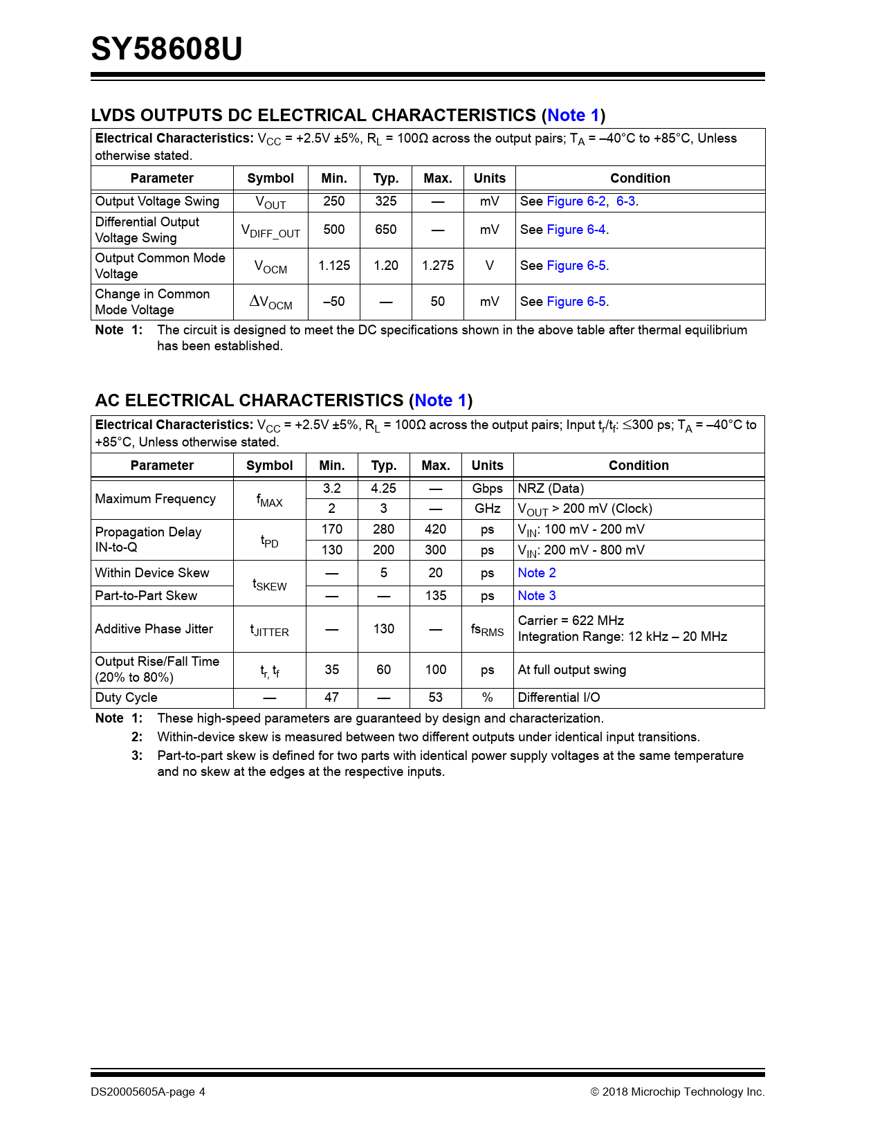 link to page 4 link to page 4 link to page 4 link to page 4 link to page 12 link to page 12 link to page 12 link to page 12 link to page 12 SY58608ULVDS OUTPUTS DC ELECTRICAL CHARACTERISTICS (Note 1)Electrical Characteristics: VCC = +2.5V ±5%, RL = 100Ω across the output pairs; TA = –40°C to +85°C, Unless otherwise stated. ParameterSymbolMin.Typ.Max.UnitsCondition Output Voltage Swing VOUT 250 325 — mV See Figure 6-2, 6-3. Differential Output V Voltage Swing DIFF_OUT 500 650 — mV See Figure 6-4. Output Common Mode V Voltage OCM 1.125 1.20 1.275 V See Figure 6-5. Change in Common V Mode Voltage OCM –50 — 50 mV See Figure 6-5. Note 1: The circuit is designed to meet the DC specifications shown in the above table after thermal equilibrium has been established. AC ELECTRICAL CHARACTERISTICS (Note 1) Electrical Characteristics: VCC = +2.5V ±5%, RL = 100Ω across the output pairs; Input tr/tf: 300 ps; TA = –40°C to +85°C, Unless otherwise stated. ParameterSymbolMin.Typ.Max.UnitsCondition 3.2 4.25 — Gbps NRZ (Data) Maximum Frequency fMAX 2 3 — GHz VOUT > 200 mV (Clock) Propagation Delay 170 280 420 ps V t IN: 100 mV - 200 mV IN-to-Q PD 130 200 300 ps VIN: 200 mV - 800 mV Within Device Skew — 5 20 ps Note 2 tSKEW Part-to-Part Skew — — 135 ps Note 3 Carrier = 622 MHz Additive Phase Jitter tJITTER — 130 — fsRMS Integration Range: 12 kHz – 20 MHz Output Rise/Fall Time t (20% to 80%) r, tf 35 60 100 ps At full output swing Duty Cycle — 47 — 53 % Differential I/O Note 1: These high-speed parameters are guaranteed by design and characterization. 2: Within-device skew is measured between two different outputs under identical input transitions. 3: Part-to-part skew is defined for two parts with identical power supply voltages at the same temperature and no skew at the edges at the respective inputs. DS20005605A-page 4 2018 Microchip Technology Inc. Document Outline 1.0 Electrical Characteristics 2.0 Functional Description 2.1 Fail-Safe Input (FSI) 2.2 Input Clock Failure Case 3.0 Timing Diagrams 4.0 Typical Performance Curves 5.0 Additive Phase Noise Plot 6.0 Input Stage 7.0 Input Interface Applications 8.0 Pin Descriptions 9.0 Packaging Information 9.1 Package Marking Information Appendix A: Revision History Product Identification System Worldwide Sales and Service