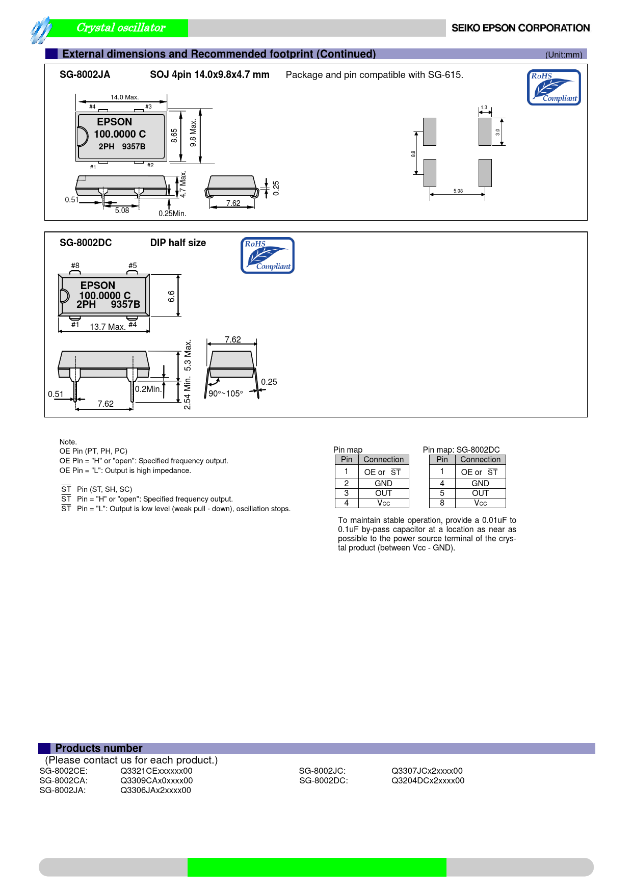 Crystal oscillator External dimensions and Recommended footprint (Continued) (Unit:mm) SG-8002JASOJ 4pin 14.0x9.8x4.7 mm Package and pin compatible with SG-615. 14.0 Max. #4 #3 1.3 EPSON x. 5 100.0000 C 6 Ma .0 . 3 8 8.9 2PH 9357B .8 8 #1 #2 .x Ma 5 7 2 . 5.08 4 0 0.51 7.62 5.08 0.25Min. SG-8002DCDIP half size #8 #5 EPSON100.0000 C 6.6 2PH 9357B #1 13.7 Max. #4 . 7.62 ax M 5.3 n. 0.25 0.2Min. Mi 0.51 90~105 7.62 2.54 Note. OE Pin (PT, PH, PC) Pin map Pin map: SG-8002DC OE Pin = "H" or "open": Specified frequency output. Pin Connection Pin Connection OE Pin = "L": Output is high impedance. 1 OE or ST 1 OE or ST 2 GND 4 GND ST Pin (ST, SH, SC) 3 OUT 5 OUT ST Pin = "H" or "open": Specified frequency output. 4 VCC 8 VCC ST Pin = "L": Output is low level (weak pull - down), oscillation stops. To maintain stable operation, provide a 0.01uF to 0.1uF by-pass capacitor at a location as near as possible to the power source terminal of the crys- tal product (between Vcc - GND). Products number (Please contact us for each product.) SG-8002CE: Q3321CExxxxxx00 SG-8002JC: Q3307JCx2xxxx00 SG-8002CA: Q3309CAx0xxxx00 SG-8002DC: Q3204DCx2xxxx00 SG-8002JA: Q3306JAx2xxxx00 Document Outline SG-8002series_E187.pdf QMEMS_E152