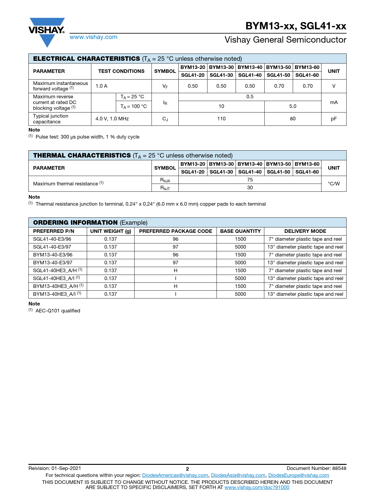 (Example) PREFERRED P/N UNIT WEIGHT (g) PREFERRED PACKAGE CODE BASE QUANTITY DELIVERY MODE SGL41-40-E3/96 0.137 96 1500 7" diameter plastic tape and reel SGL41-40-E3/97 0.137 97 5000 13" diameter plastic tape and reel BYM13-40-E3/96 0.137 96 1500 7" diameter plastic tape and reel BYM13-40-E3/97 0.137 97 5000 13" diameter plastic tape and reel SGL41-40HE3_A/H (1) 0.137 H 1500 7" diameter plastic tape and reel SGL41-40HE3_A/I (1) 0.137 I 5000 13" diameter plastic tape and reel BYM13-40HE3_A/H (1) 0.137 H 1500 7" diameter plastic tape and reel BYM13-40HE3_A/I (1) 0.137 I 5000 13" diameter plastic tape and reel Note (1) AEC-Q101 qualified Reivision: 01-Sep-2021 2 Document Number: 88548 For technical questions within your region: DiodesAmericas@vishay.com, DiodesAsia@vishay.com, DiodesEurope@vishay.com THIS DOCUMENT IS SUBJECT TO CHANGE WITHOUT NOTICE. THE PRODUCTS DESCRIBED HEREIN AND THIS DOCUMENT ARE SUBJECT TO SPECIFIC DISCLAIMERS, SET FORTH AT www.vishay.com/doc?91000