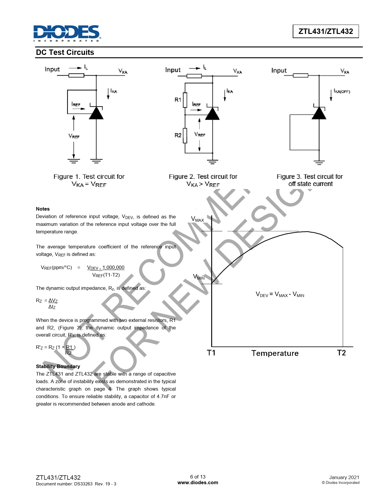 | Páginas / Página | 13 / 6 — ZTL431/ZTL432. DC Test Circuits. Notes. Stability Boundary. www.diodes.com |