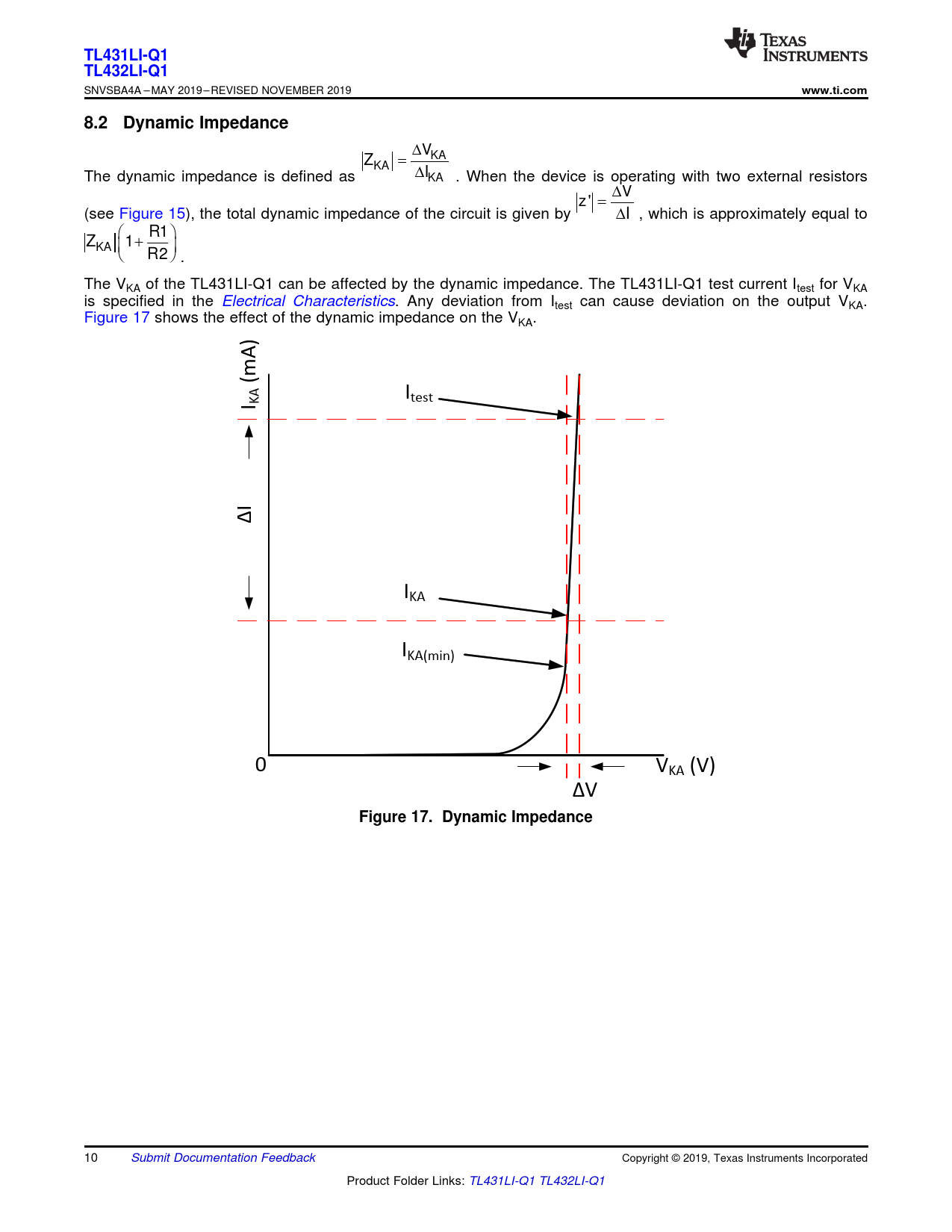 ' K V A K Z A The dynamic impedance is defined as ' K I A . When the device is operating with two external resistors 'V z' (see Figure 15), the total dynamic impedance of the circuit is given by 'I , which is approximately equal to § R1 · K Z A ¨1 ¸ © R2 ¹ . The VKA of the TL431LI-Q1 can be affected by the dynamic impedance. The TL431LI-Q1 test current Itest for VKA is specified in the Electrical Characteristics. Any deviation from Itest can cause deviation on the output VKA. Figure 17 shows the effect of the dynamic impedance on the VKA. ) A (m A I I K test / P IKA IKA(min) 0 VKA (V) Ps