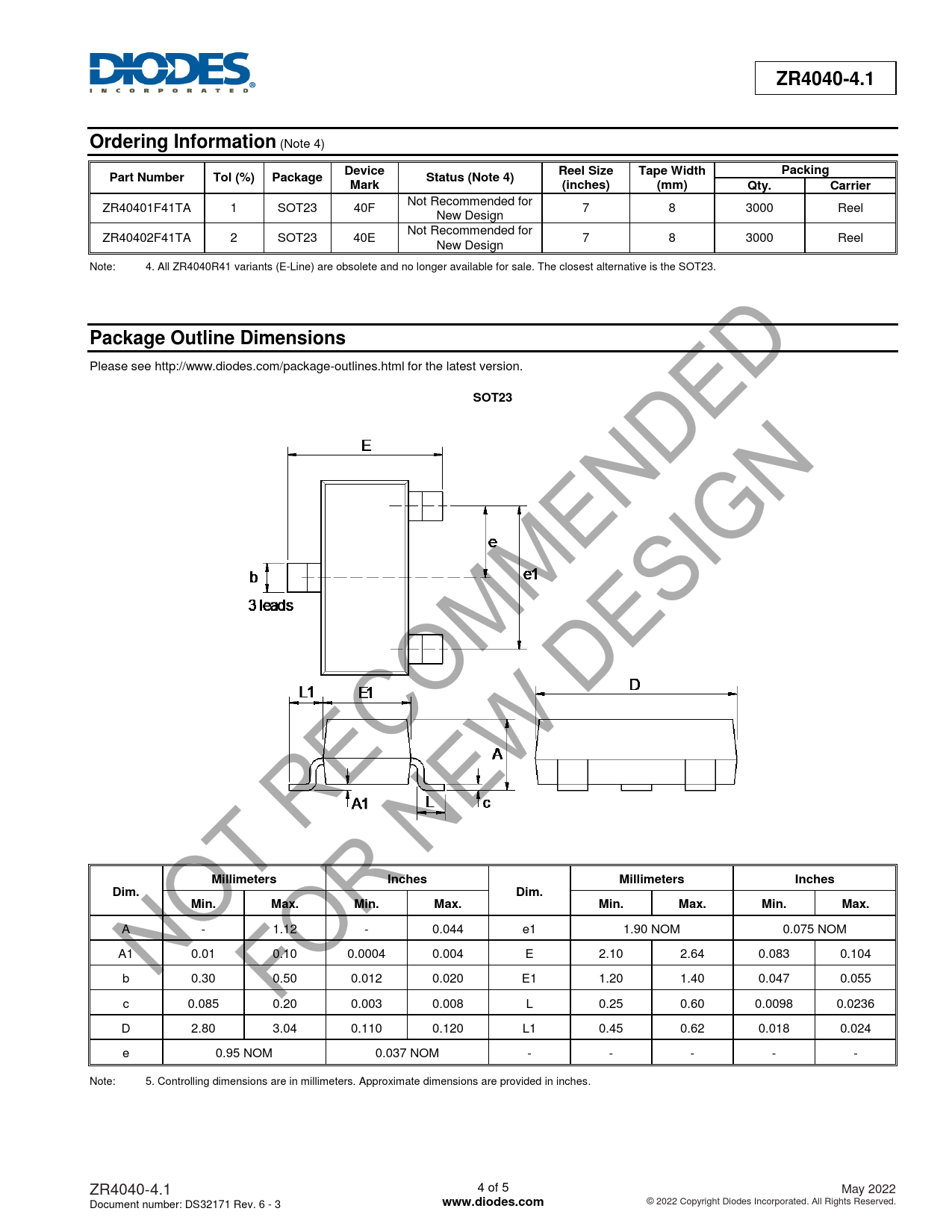 Not Recommended for ZR40401F41TA 1 SOT23 40F 7 8 3000 Reel New Design Not Recommended for ZR40402F41TA 2 SOT23 40E 7 8 3000 Reel New Design Note: 4. All ZR4040R41 variants (E-Line) are obsolete and no longer available for sale. The closest alternative is the SOT23.