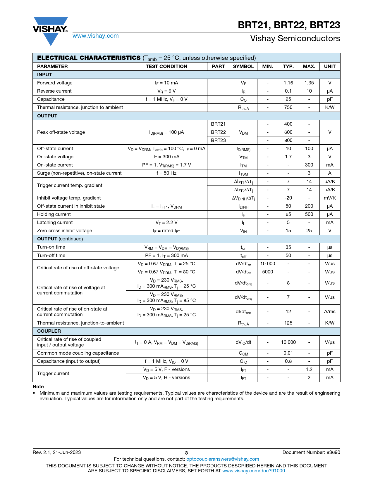 BRT21, BRT22, BRT23 www.vishay.com Vishay Semiconductors ELECTRICAL CHARACTERISTICS (Tamb = 25 °C, unless otherwise specified) PARAMETERTEST CONDITIONPARTSYMBOLMIN.TYP.MAX.UNITINPUT Forward voltage IF = 10 mA VF - 1.16 1.35 V Reverse current VR = 6 V IR - 0.1 10 μA Capacitance f = 1 MHz, VF = 0 V CO - 25 - pF Thermal resistance, junction to ambient RthJA - 750 - K/W OUTPUT BRT21 - 400 - Peak off-state voltage ID(RMS) = 100 μA BRT22 VDM - 600 - V BRT23 - 800 - Off-state current VD = VDRM, Tamb = 100 °C, IF = 0 mA ID(RMS) - 10 100 μA On-state voltage IT = 300 mA VTM - 1.7 3 V On-state current PF = 1, VT(RMS) = 1.7 V ITM - - 300 mA Surge (non-repetitive), on-state current f = 50 Hz ITSM - - 3 A ΔIFT1/ΔTj - 7 14 μA/K Trigger current temp. gradient ΔIFT2/ΔTj - 7 14 μA/K Inhibit voltage temp. gradient ΔVDINH/ΔTj - -20 - mV/K Off-state current in inhibit state IF = IFT1, VDRM IDINH - 50 200 μA Holding current IH - 65 500 μA Latching current VT = 2.2 V IL - 5 - mA Zero cross inhibit voltage IF = rated IFT VIH - 15 25 V OUTPUT (continued) Turn-on time VRM = VDM = VD(RMS) ton - 35 - μs Turn-off time PF = 1, IT = 300 mA toff - 50 - μs VD = 0.67 VDRM, Tj = 25 °C dV/dtcr 10 000 - - V/μs Critical rate of rise of off-state voltage VD = 0.67 VDRM, Tj = 80 °C dV/dtcr 5000 - - V/μs VD = 230 VRMS, dV/dtcrq - 8 - V/μs Critical rate of rise of voltage at ID = 300 mARMS, Tj = 25 °C current commutation VD = 230 VRMS, dV/dt I crq - 7 - V/μs D = 300 mARMS, Tj = 85 °C Critical rate of rise of on-state at VD = 230 VRMS, dI/dt current commutation I crq - 12 - A/ms D = 300 mARMS, Tj = 25 °C Thermal resistance, junction-to-ambient RthJA - 125 - K/W COUPLER Critical rate of rise of coupled I input / output voltage T = 0 A, VRM = VDM = VD(RMS) dVIO/dt - 10 000 - V/μs Common mode coupling capacitance CCM - 0.01 - pF Capacitance (input to output) f = 1 MHz, VIO = 0 V CIO - 0.8 - pF VD = 5 V, F - versions IFT - - 1.2 mA Trigger current VD = 5 V, H - versions IFT - - 2 mA Note • Minimum and maximum values are testing requirements. Typical values are characteristics of the device and are the result of engineering evaluation. Typical values are for information only and are not part of the testing requirements. Rev. 2.1, 21-Jun-2023 3 Document Number: 83690 For technical questions, contact: optocoupleranswers@vishay.com THIS DOCUMENT IS SUBJECT TO CHANGE WITHOUT NOTICE. THE PRODUCTS DESCRIBED HEREIN AND THIS DOCUMENT ARE SUBJECT TO SPECIFIC DISCLAIMERS, SET FORTH AT www.vishay.com/doc?91000