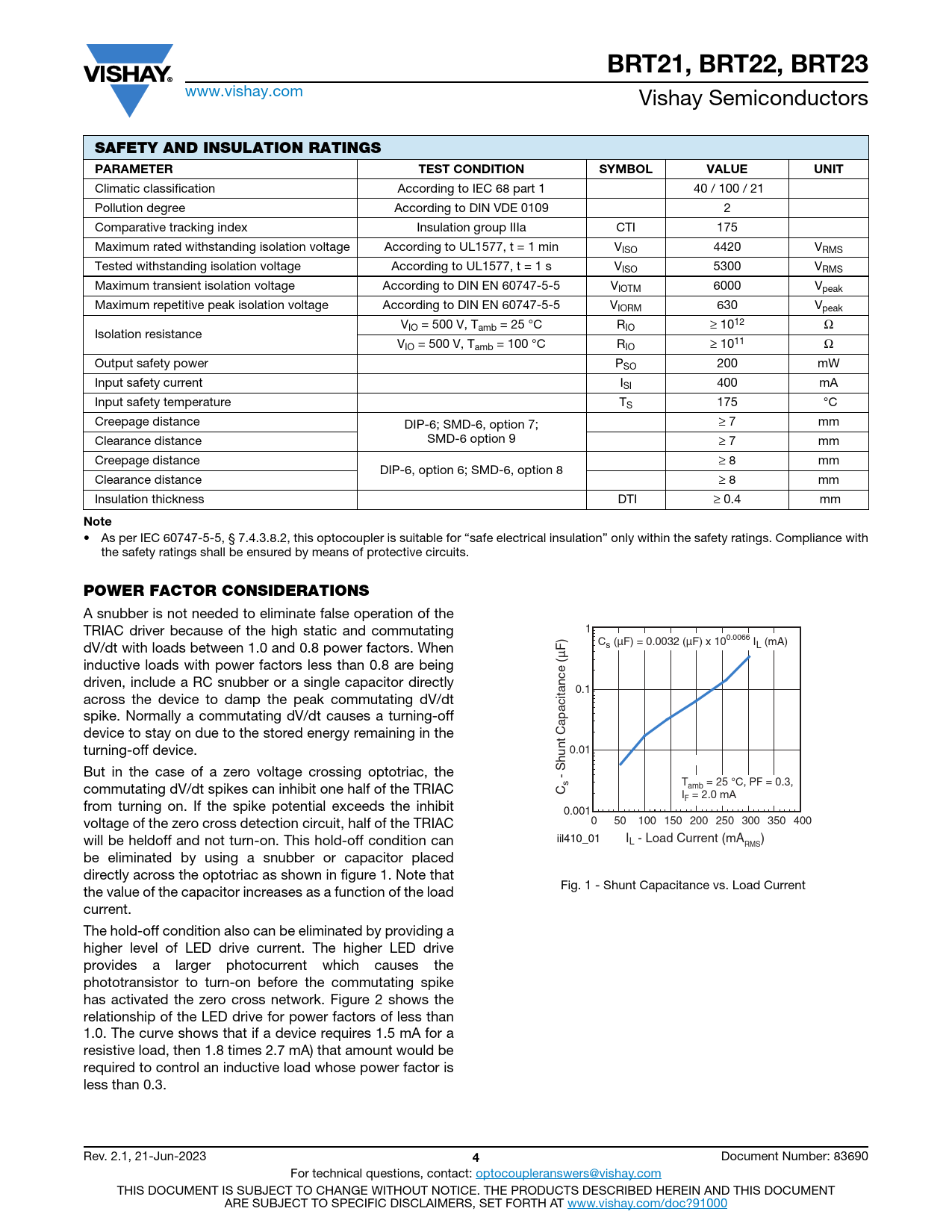 BRT21, BRT22, BRT23. SAFETY AND INSULATION RATINGS PARAMETER. TEST CONDITION. SYMBOL. VALUE. UNIT. Note. POWER FACTOR CONSIDERATIONS