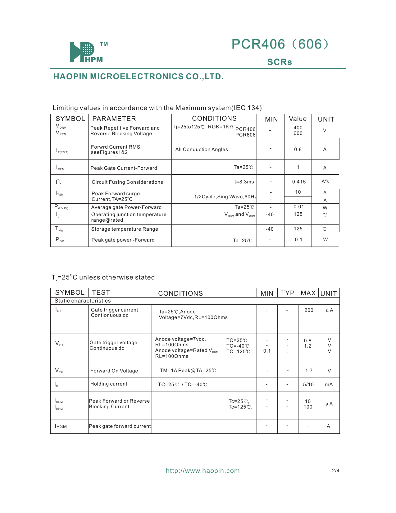PCR406 TM HPM 606 SCRs HAOPIN MICROELECTRONICS CO.,LTD. Limiting values in accordance with the Maximum system(IEC 134) SYMBOL CONDITIONS PARAMETER V DRM V RRM Peak Repetitive Forward and Reverse Blocking Voltage I T(RMS) Forwrd Current RMS seeFigures1&2 I GFM Peak Gate Current-Forward It Circuit Fusing Considerations I TSM Peak Forward surge Current,TA=25 0C P GF(AV) Tj Average gate Power-Forward Operating junction temperature range@rated T stg Storage temperature Range P GM Peak gate power -Forward 2 Tj=25to125 ,RGK=1K Value UNIT -400 600 V -0.8 A Ta=25 -1 A t=8.3ms -0.415 A 2s -A -40 10 0.01 125 -40 125 -0.1 MIN PCR406 PCR606 All Conduction Angles 1/2Cycle,Sing Wave,60H Z Ta=25 V RRM and V DRM Ta=25 A W W O T J=25 C unless otherwise stated SYMBOL TEST MIN CONDITIONS TYP MAX UNIT Static characteristics I GT Gate trigger current Contionuous dc V GT Gate trigger voltage Continuous dc V TM Forward On Voltage IH Holding current I DRM I RRM Peak Forward or Reverse Blocking Current I FGM Peak gate forward current -200 0.1 -0.8 1.2 -V V V ITM=1A Peak@TA=25 -1.7 V TC=25 -5/10 mA -10 100 A -Ta=25 ,Anode Voltage=7Vdc,RL=100Ohms Anode voltage=7vdc, RL=100Ohms Anode voltage=Rated V DRM, RL=100Ohms TC=25 TC=-40 TC=125 / TC=-40 Tc=25 , Tc=125 , http://www.haopin.com A A 2/4