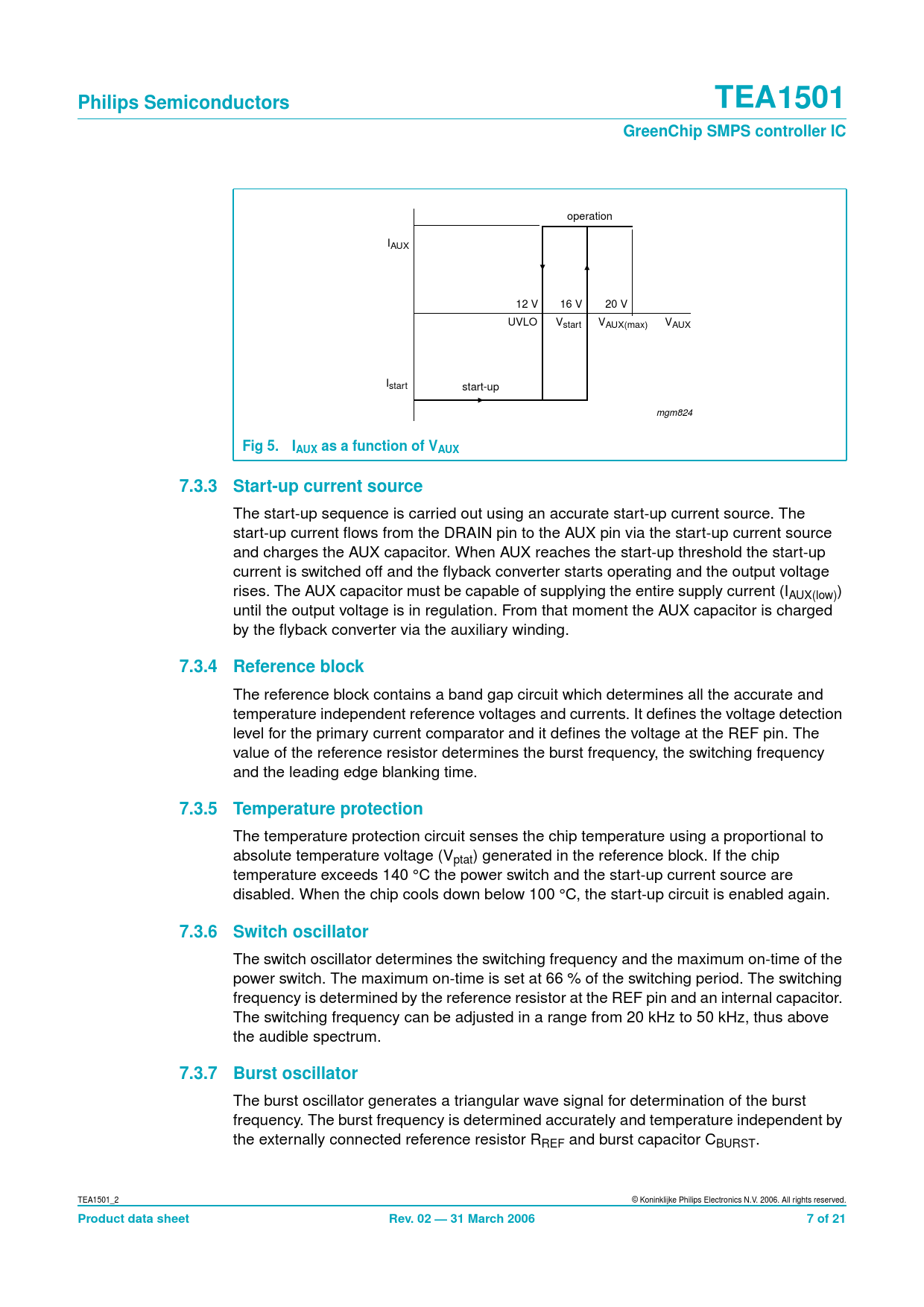 Philips Semiconductors. TEA1501. GreenChip SMPS controller IC. Fig 5. IAUX as a function of VAUX. 7.3.3 Start-up current source