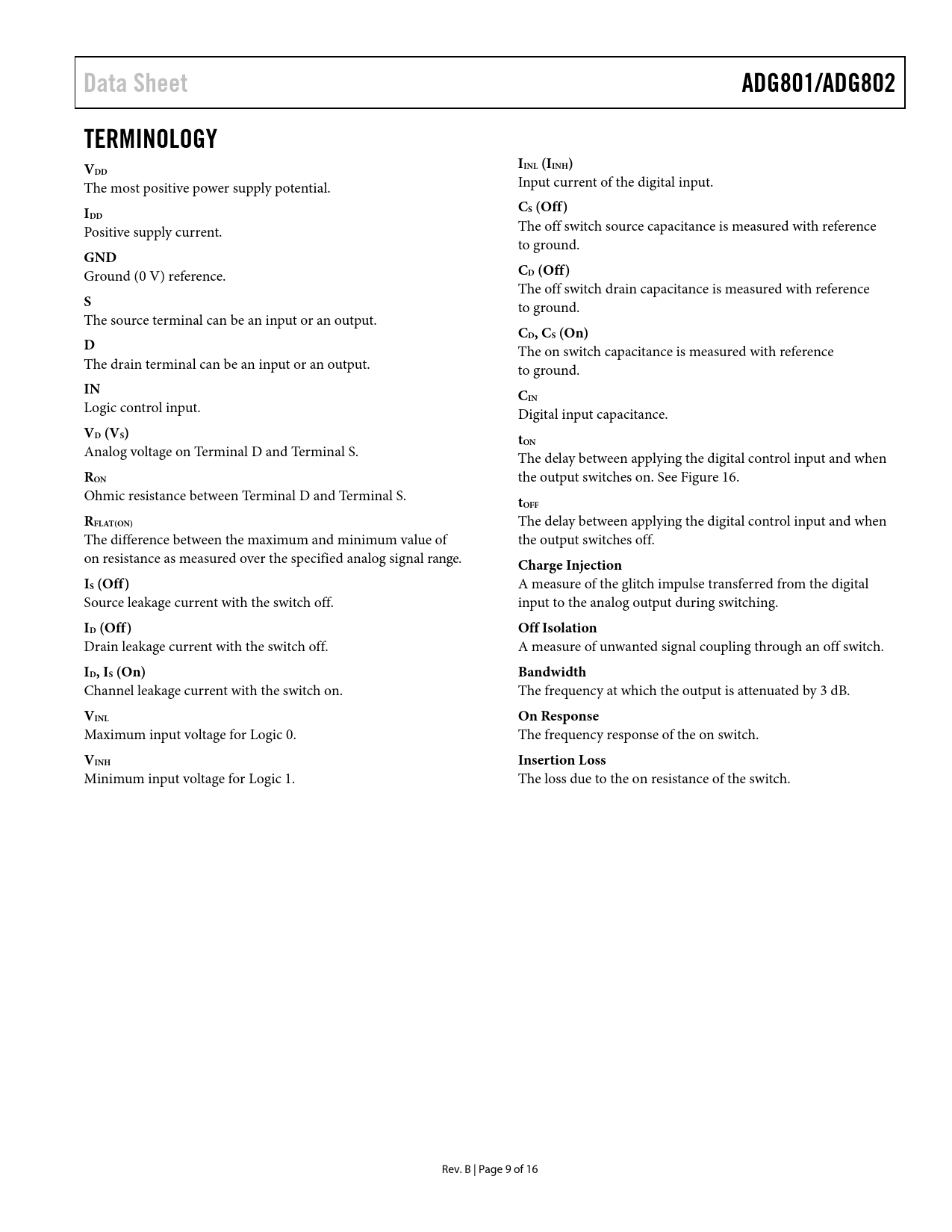 Data Sheet. ADG801/ADG802. TERMINOLOGY V. IINL (IINH). CS (Off). GND. CD (Off). CD, CS (On). CIN. VD (VS). tON. RON. tOFF. RFLAT(ON)