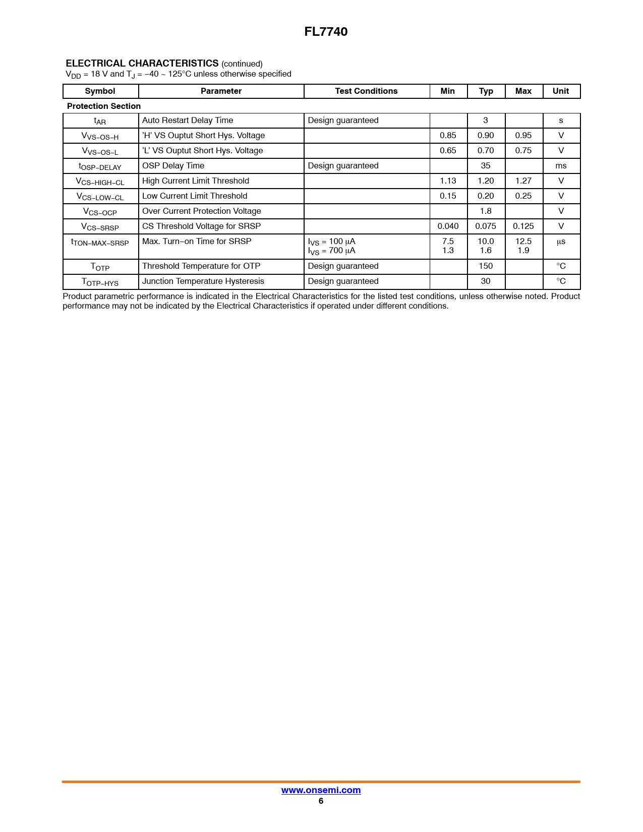FL7740ELECTRICAL CHARACTERISTICS (continued) VDD = 18 V and TJ = −40 ~ 125°C unless otherwise specified SymbolParameterTest ConditionsMinTypMaxUnitProtection Section tAR Auto Restart Delay Time Design guaranteed 3 s VVS−OS−H ’H’ VS Ouptut Short Hys. Voltage 0.85 0.90 0.95 V VVS−OS−L ’L’ VS Ouptut Short Hys. Voltage 0.65 0.70 0.75 V tOSP−DELAY OSP Delay Time Design guaranteed 35 ms VCS−HIGH−CL High Current Limit Threshold 1.13 1.20 1.27 V VCS−LOW−CL Low Current Limit Threshold 0.15 0.20 0.25 V VCS−OCP Over Current Protection Voltage 1.8 V VCS−SRSP CS Threshold Voltage for SRSP 0.040 0.075 0.125 V tTON−MAX−SRSP Max. Turn−on Time for SRSP IVS = 100 A 7.5 10.0 12.5 s IVS = 700 A 1.3 1.6 1.9 TOTP Threshold Temperature for OTP Design guaranteed 150 °C TOTP−HYS Junction Temperature Hysteresis Design guaranteed 30 °C Product parametric performance is indicated in the Electrical Characteristics for the listed test conditions, unless otherwise noted. Product performance may not be indicated by the Electrical Characteristics if operated under different conditions. www.onsemi.com6