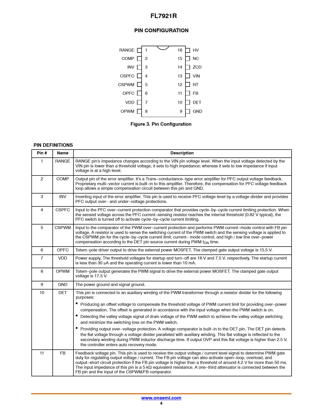 FL7921R. PIN CONFIGURATION. Figure 3. Pin Configuration. PIN DEFINITIONS. Pin #. Name. Description. www.onsemi.com