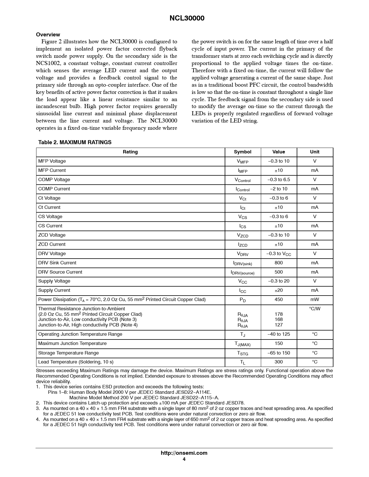 link to page 4 link to page 5 link to page 5 NCL30000Overview Figure 2 illustrates how the NCL30000 is configured to the power switch is on for the same length of time over a half implement an isolated power factor corrected flyback cycle of input power. The current in the primary of the switch mode power supply. On the secondary side is the transformer starts at zero each switching cycle and is directly NCS1002, a constant voltage, constant current controller proportional to the applied voltage times the on-time. which senses the average LED current and the output Therefore with a fixed on-time, the current will follow the voltage and provides a feedback control signal to the applied voltage generating a current of the same shape. Just primary side through an opto-coupler interface. One of the as in a traditional boost PFC circuit, the control bandwidth key benefits of active power factor correction is that it makes is low so that the on-time is constant throughout a single line the load appear like a linear resistance similar to an cycle. The feedback signal from the secondary side is used incandescent bulb. High power factor requires generally to modify the average on-time so the current through the sinusoidal line current and minimal phase displacement LEDs is properly regulated regardless of forward voltage between the line current and voltage. The NCL30000 variation of the LED string. operates in a fixed on-time variable frequency mode where Table 2. MAXIMUM RATINGSRatingSymbolValueUnit MFP Voltage VMFP −0.3 to 10 V MFP Current IMFP 10 mA COMP Voltage VControl −0.3 to 6.5 V COMP Current IControl −2 to 10 mA Ct Voltage VCt −0.3 to 6 V Ct Current ICt 10 mA CS Voltage VCS −0.3 to 6 V CS Current ICS 10 mA ZCD Voltage VZCD −0.3 to 10 V ZCD Current IZCD 10 mA DRV Voltage VDRV −0.3 to VCC V DRV Sink Current IDRV(sink) 800 mA DRV Source Current IDRV(source) 500 mA Supply Voltage VCC −0.3 to 20 V Supply Current ICC 20 mA Power Dissipation (TA = 70C, 2.0 Oz Cu, 55 mm2 Printed Circuit Copper Clad) PD 450 mW Thermal Resistance Junction-to-Ambient C/W (2.0 Oz Cu, 55 mm2 Printed Circuit Copper Clad) RqJA 178 Junction-to-Air, Low conductivity PCB (Note 3) RqJA 168 Junction-to-Air, High conductivity PCB (Note 4) RqJA 127 Operating Junction Temperature Range TJ −40 to 125 C Maximum Junction Temperature TJ(MAX) 150 C Storage Temperature Range TSTG −65 to 150 C Lead Temperature (Soldering, 10 s) TL 300 C Stresses exceeding Maximum Ratings may damage the device. Maximum Ratings are stress ratings only. Functional operation above the Recommended Operating Conditions is not implied. Extended exposure to stresses above the Recommended Operating Conditions may affect device reliability. 1. This device series contains ESD protection and exceeds the following tests: Pins 1–8: Human Body Model 2000 V per JEDEC Standard JESD22−A114E. Pins 1– 8:Machine Model Method 200 V per JEDEC Standard JESD22−A115−A. 2. This device contains Latch-up protection and exceeds 100 mA per JEDEC Standard JESD78. 3. As mounted on a 40 40 1.5 mm FR4 substrate with a single layer of 80 mm2 of 2 oz copper traces and heat spreading area. As specified for a JEDEC 51 low conductivity test PCB. Test conditions were under natural convection or zero air flow. 4. As mounted on a 40 40 1.5 mm FR4 substrate with a single layer of 650 mm2 of 2 oz copper traces and heat spreading area. As specified for a JEDEC 51 high conductivity test PCB. Test conditions were under natural convection or zero air flow. http://onsemi.com4