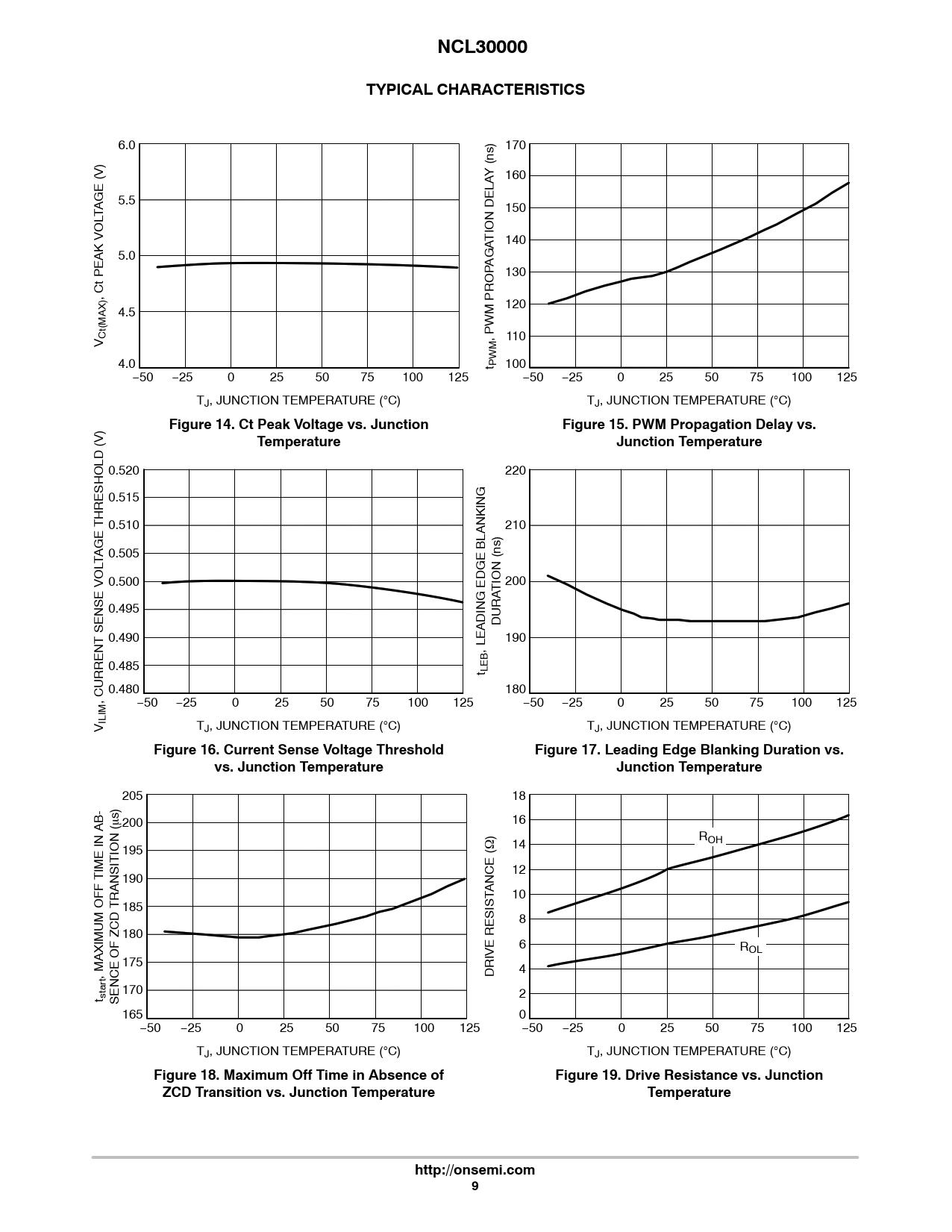 NCL30000. TYPICAL CHARACTERISTICS. Figure 14. Ct Peak Voltage vs. Junction. Figure 15. PWM Propagation Delay vs. Temperature