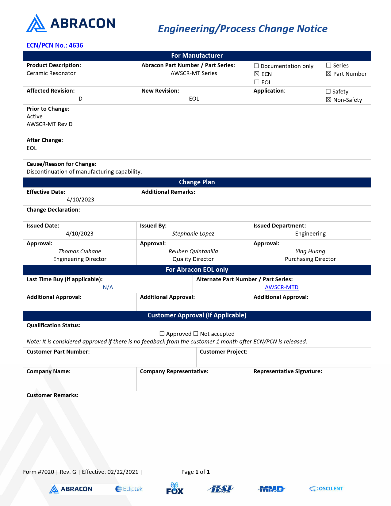 Engineering/Process Change Notice ECN/PCN No.: 4636 For Manufacturer Product Description: Abracon Part Number / Part Series: