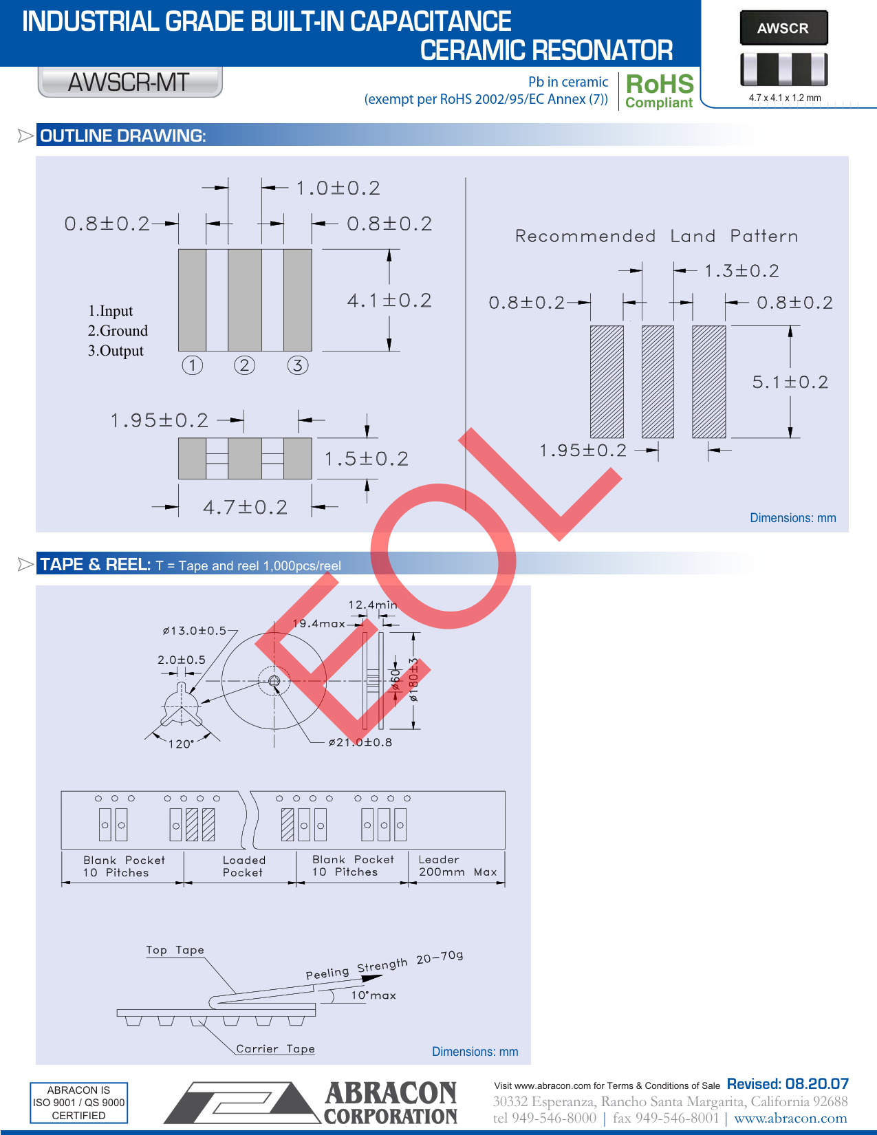 INDUSTRIAL GRADE BUILT-IN CAPACITANCE. CERAMIC RESONATOR. RoHS. Compliant. OUTLINE DRAWING:. TAPE & REEL:. Revised: 08.20.07