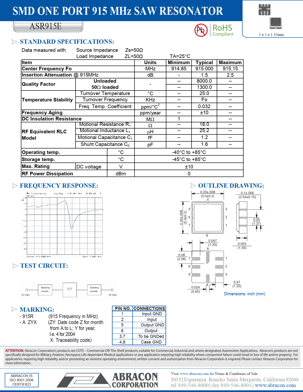 - 915R (915 Frequency in MHz) 1 Input GND - A ZYX (ZY: Date code Z for month 2 Input from A to L; Y for year, 5 Output GND 6 Output I.e. 4 for 2004 3,7 To be GNDed X: Traceability code) 4,8 Case GND