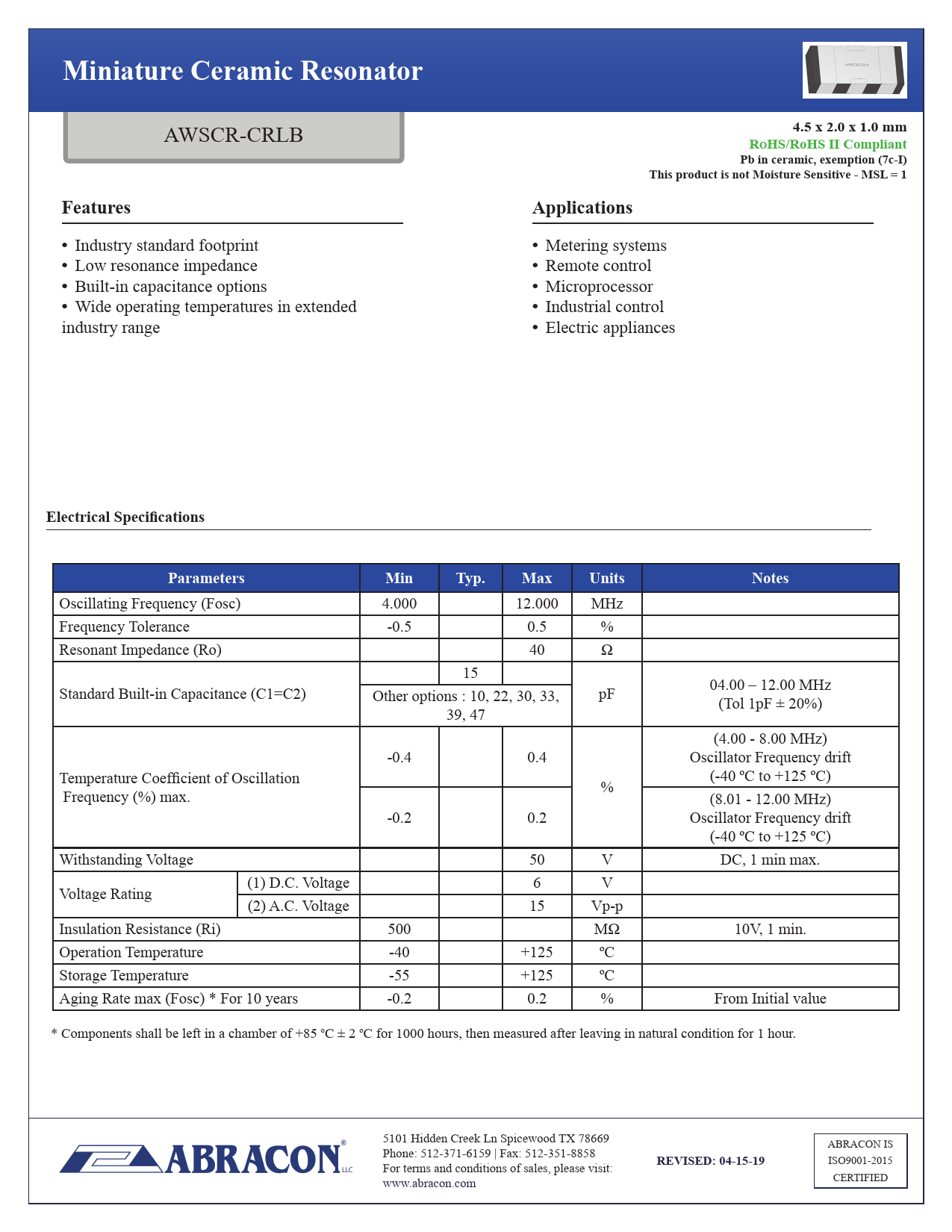 Miniature Ceramic Resonator4.5 x 2.0 x 1.0 mm AWSCR-CRLB RoHS/RoHS II CompliantPb in ceramic, exemption (7c-I)This product is not Moisture Sensitive - MSL = 1FeaturesApplications• Industry standard footprint • Metering systems • Low resonance impedance • Remote control • Built-in capacitance options • Microprocessor • Wide operating temperatures in extended • Industrial control industry range • Electric appliances Electrical SpecificationsParametersMinTyp.MaxUnitsNotes Oscillating Frequency (Fosc) 4.000 12.000 MHz Frequency Tolerance -0.5 0.5 % Resonant Impedance (Ro) 40 Ω 15 Standard Built-in Capacitance (C1=C2) Other options : 10, 22, 30, 33, pF 04.00 – 12.00 MHz (Tol 1pF ± 20%) 39, 47 (4.00 - 8.00 MHz) -0.4 0.4 Oscillator Frequency drift Temperature Coefficient of Oscillation (-40 ºC to +125 ºC) Frequency (%) max. % (8.01 - 12.00 MHz) -0.2 0.2 Oscillator Frequency drift (-40 ºC to +125 ºC) Withstanding Voltage 50 V DC, 1 min max. (1) D.C. Voltage 6 V Voltage Rating (2) A.C. Voltage 15 Vp-p Insulation Resistance (Ri) 500 MΩ 10V, 1 min. Operation Temperature -40 +125 ºC Storage Temperature -55 +125 ºC Aging Rate max (Fosc) * For 10 years -0.2 0.2 % From Initial value * Components shall be left in a chamber of +85 oC ± 2 oC for 1000 hours, then measured after leaving in natural condition for 1 hour. 5101 Hidden Creek Ln Spicewood TX 78669 ABRACON IS Phone: 512-371-6159 | Fax: 512-351-8858 REVISED: 04-15-19 ISO9001-2015 LLC For terms and conditions of sales, please visit: CERTIFIED www.abracon.com