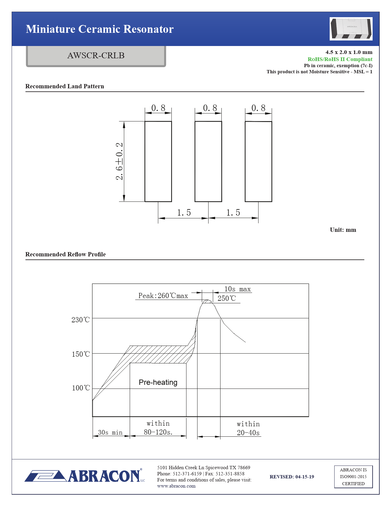 10s max Peak:260℃max 250℃ 230℃ 150℃ Pre-heating 100℃ within within 30s min 80-120s. 20-40s 5101 Hidden Creek Ln Spicewood TX 78669 ABRACON IS Phone: 512-371-6159 | Fax: 512-351-8858