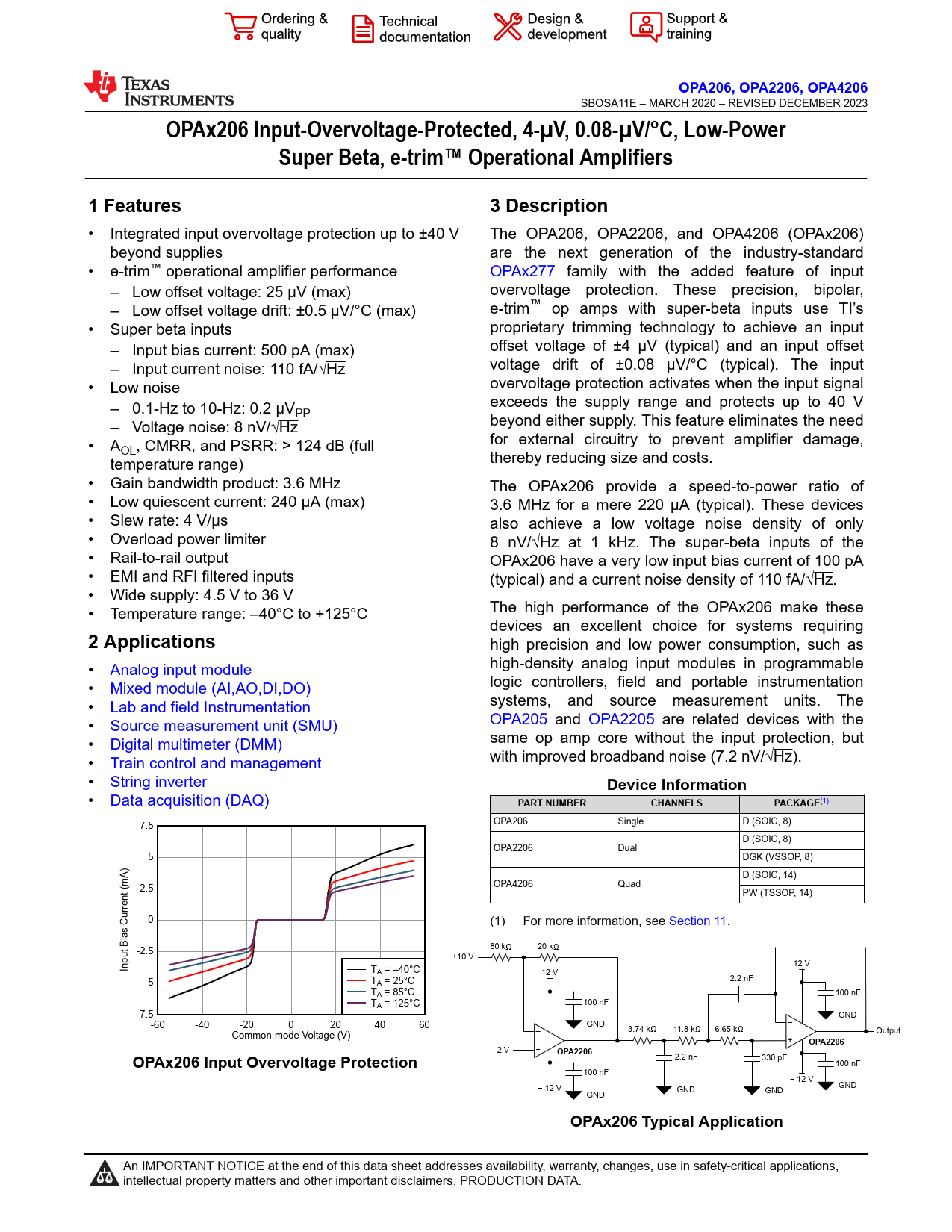 link to page 1 link to page 31 OPA206, OPA2206, OPA4206 SBOSA11E – MARCH 2020 – REVISED DECEMBER 2023 OPAx206 Input-Overvoltage-Protected, 4-µV, 0.08-µV/°C, Low-PowerSuper Beta, e-trim™ Operational Amplifiers1 Features3 Description • Integrated input overvoltage protection up to ±40 V The OPA206, OPA2206, and OPA4206 (OPAx206) beyond supplies are the next generation of the industry-standard • e-trim™ operational amplifier performance OPAx277 family with the added feature of input – Low offset voltage: 25 µV (max) overvoltage protection. These precision, bipolar, – Low offset voltage drift: ±0.5 µV/°C (max) e‑trim™ op amps with super-beta inputs use TI’s • Super beta inputs proprietary trimming technology to achieve an input – Input bias current: 500 pA (max) offset voltage of ±4 μV (typical) and an input offset – Input current noise: 110 fA/√Hz voltage drift of ±0.08 μV/°C (typical). The input • Low noise overvoltage protection activates when the input signal – 0.1-Hz to 10-Hz: 0.2 µV exceeds the supply range and protects up to 40 V PP – Voltage noise: 8 nV/√Hz beyond either supply. This feature eliminates the need • A for external circuitry to prevent amplifier damage, OL, CMRR, and PSRR: > 124 dB (full temperature range) thereby reducing size and costs. • Gain bandwidth product: 3.6 MHz The OPAx206 provide a speed-to-power ratio of • Low quiescent current: 240 µA (max) 3.6 MHz for a mere 220 μA (typical). These devices • Slew rate: 4 V/µs also achieve a low voltage noise density of only • Overload power limiter 8 nV/√Hz at 1 kHz. The super-beta inputs of the • Rail-to-rail output OPAx206 have a very low input bias current of 100 pA • EMI and RFI filtered inputs (typical) and a current noise density of 110 fA/√Hz. • Wide supply: 4.5 V to 36 V • Temperature range: –40°C to +125°C The high performance of the OPAx206 make these devices an excellent choice for systems requiring 2 Applications high precision and low power consumption, such as • Analog input module high-density analog input modules in programmable • Mixed module (AI,AO,DI,DO) logic controllers, field and portable instrumentation • Lab and field Instrumentation systems, and source measurement units. The • Source measurement unit (SMU) OPA205 and OPA2205 are related devices with the • Digital multimeter (DMM) same op amp core without the input protection, but • Train control and management with improved broadband noise (7.2 nV/√Hz). • String inverter Device Information • Data acquisition (DAQ) PART NUMBERCHANNELSPACKAGE (1) OPA206 Single D (SOIC, 8) 7.5 D (SOIC, 8) OPA2206 Dual 5 DGK (VSSOP, 8) A) D (SOIC, 14) OPA4206 Quad 2.5 PW (TSSOP, 14) rent (m 0 (1) For more information, see Section 11. 80 k 20 k -2.5 ±10 V 12 V Input Bias Cur TA = –40°C 12 V -5 T 2.2 nF A = 25°C TA = 85°C 100 nF TA = 125°C 100 nF -7.5 GND -60 -40 -20 0 20 40 60 GND – 3.74 k 11.8 k 6.65 k Common-mode Voltage (V) – Output + OPA2206 2 V + OPA2206OPAx206 Input Overvoltage Protection 2.2 nF 330 pF 100 nF 100 nF 12 V 12 V GND GND GND GND OPAx206 Typical Application An IMPORTANT NOTICE at the end of this data sheet addresses availability, warranty, changes, use in safety-critical applications, intellectual property matters and other important disclaimers. PRODUCTION DATA. Document Outline 1 Features 2 Applications 3 Description Table of Contents 4 Pin Configuration and Functions 5 Specifications 5.1 Absolute Maximum Ratings 5.2 ESD Ratings 5.3 Recommended Operating Conditions 5.4 Thermal Information: OPA206 5.5 Thermal Information: OPA2206 5.6 Thermal Information: OPA4206 5.7 Electrical Characteristics: VS = ±5 V 5.8 Electrical Characteristics: VS = ±15 V 5.9 Typical Characteristics 6 Parameter Measurement Information 6.1 Typical Specifications and Distributions 7 Detailed Description 7.1 Overview 7.2 Functional Block Diagram 7.3 Feature Description 7.3.1 Input Overvoltage Protection 7.3.2 Input Offset Trimming 7.3.3 Lower Input Bias With Super-Beta Inputs 7.3.4 Overload Power Limiter 7.3.5 EMI Rejection 7.4 Device Functional Modes 8 Application and Implementation 8.1 Application Information 8.2 Typical Applications 8.2.1 Voltage Attenuator 8.2.1.1 Design Requirements 8.2.1.2 Detailed Design Procedure 8.2.1.3 Application Curves 8.2.2 Discrete, Two-Op-Amp Instrumentation Amplifier 8.2.3 Input Buffer and Protection for ADC Driver 8.3 Power Supply Recommendations 8.4 Layout 8.4.1 Layout Guidelines 8.4.2 Layout Example 9 Device and Documentation Support 9.1 Device Support 9.1.1 Development Support 9.1.1.1 PSpice® for TI 9.2 Documentation Support 9.2.1 Related Documentation 9.3 Receiving Notification of Documentation Updates 9.4 Support Resources 9.5 Trademarks 9.6 Electrostatic Discharge Caution 9.7 Glossary 10 Revision History 11 Mechanical, Packaging, and Orderable Information