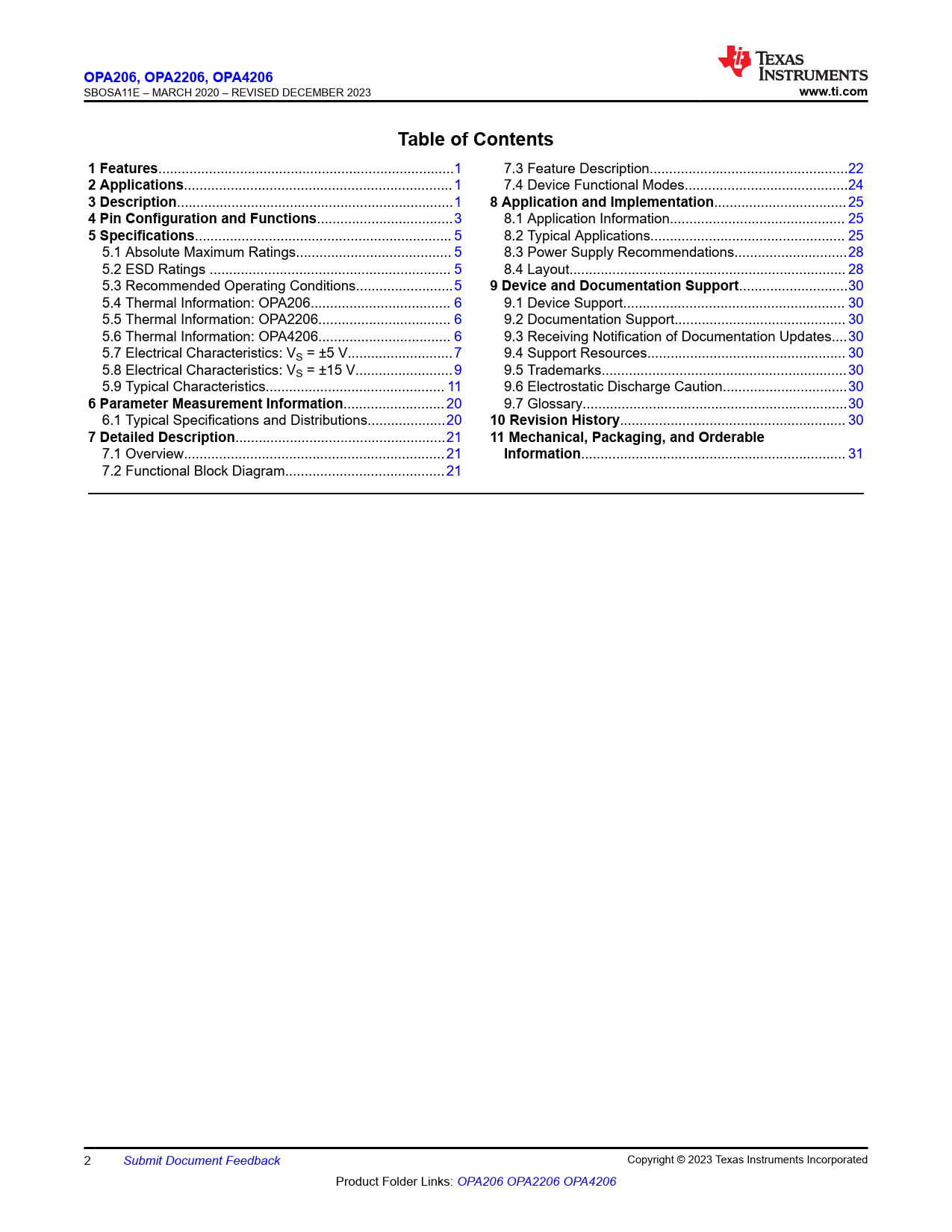 OPA206, OP. A2206, OP. A4206. www.ti.com. Table of Contents. 1 Features. 2 Applications. 3 Description