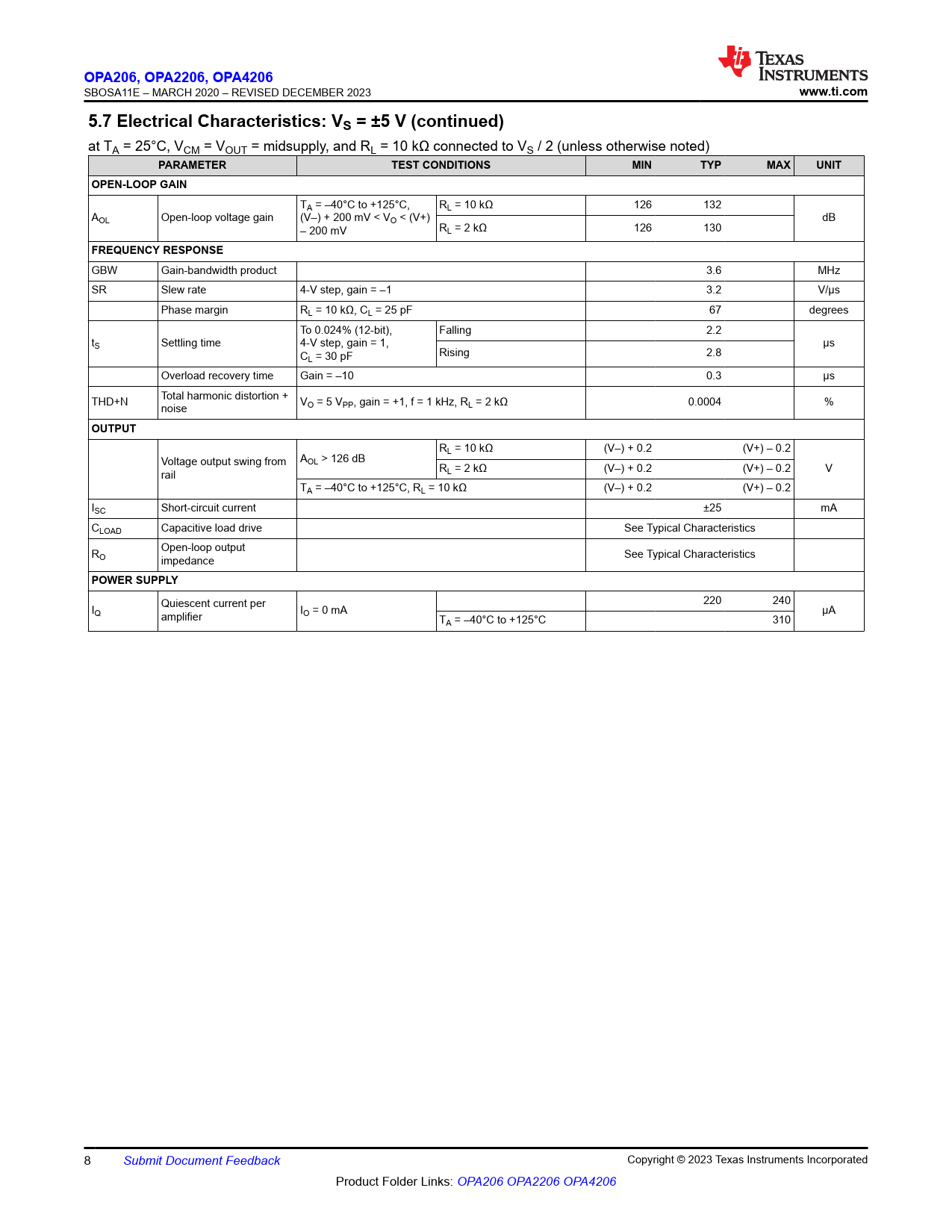 | Páginas / Página | 48 / 8 — OPA206, OP. A2206, OP. A4206. www.ti.com. 5.7 Electrical Characteristics: … |