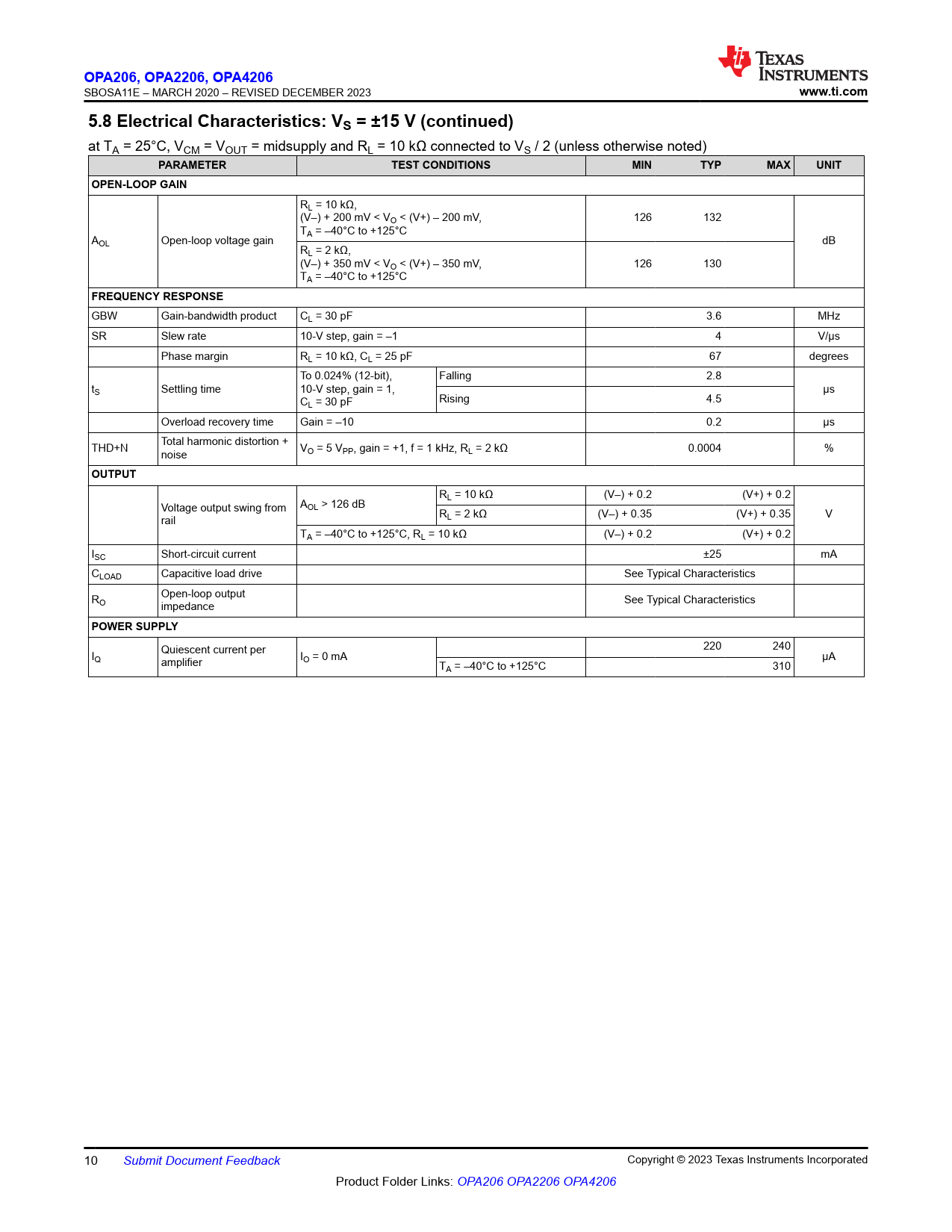 OPA206, OP. A2206, OP. A4206. www.ti.com. 5.8 Electrical Characteristics: VS = ±15 V (continued). PARAMETER. TEST CONDITIONS. MIN. TYP