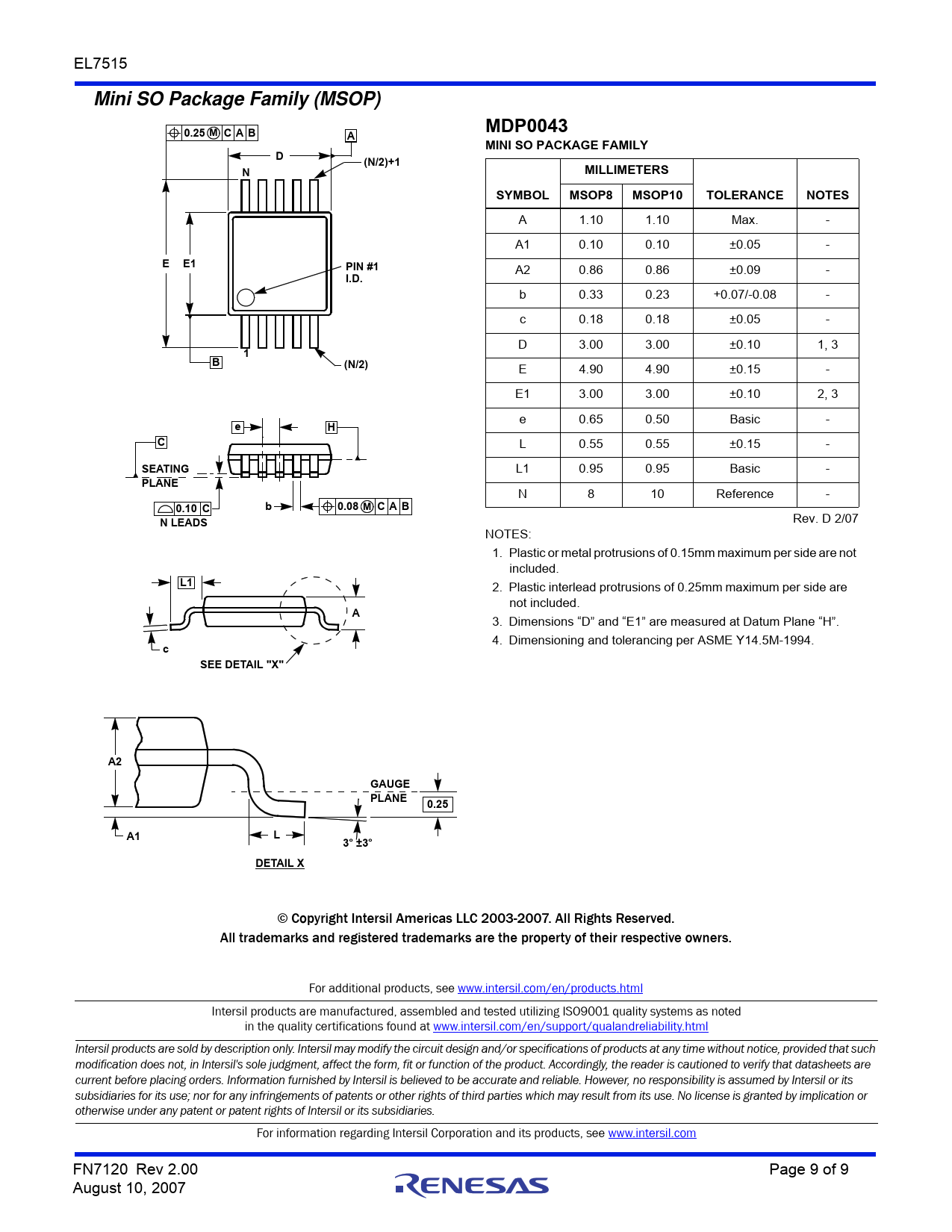 Rev. D 2/07 NOTES: 1. Plastic or metal protrusions of 0.15mm maximum per side are not included.
