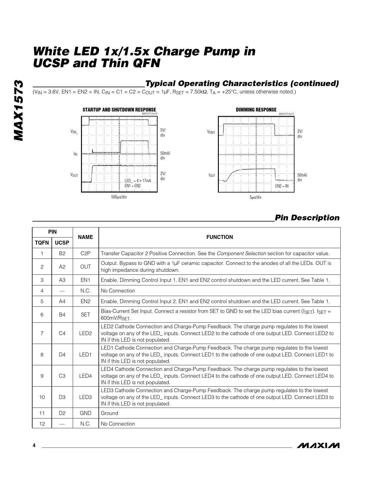1 B2 C2P Transfer Capacitor 2 Positive Connection. See the Component Selection section for capacitor value. Output. Bypass to GND with a 1µF ceramic capacitor. Connect to the anodes of all the LEDs. OUT is 2 A2 OUT high impedance during shutdown. 3 A3 EN1 Enable, Dimming Control Input 1. EN1 and EN2 control shutdown and the LED current. See Table 1. 4 — N.C. No Connection 5 A4 EN2 Enable, Dimming Control Input 2. EN1 and EN2 control shutdown and the LED current. See Table 1. Bias-Current Set Input. Connect a resistor from SET to GND to set the LED bias current (ISET). ISET = 6 B4 SET 600mV/RSET. LED2 Cathode Connection and Charge-Pump Feedback. The charge pump regulates to the lowest 7 C4 LED2 voltage on any of the LED_ inputs. Connect LED2 to the cathode of one output LED. Connect LED2 to IN if this LED is not populated. LED1 Cathode Connection and Charge-Pump Feedback. The charge pump regulates to the lowest 8 D4 LED1 voltage on any of the LED_ inputs. Connect LED1 to the cathode of one output LED. Connect LED1 to IN if this LED is not populated. LED4 Cathode Connection and Charge-Pump Feedback. The charge pump regulates to the lowest 9 C3 LED4 voltage on any of the LED_ inputs. Connect LED4 to the cathode of one output LED. Connect LED4 to IN if this LED is not populated. LED3 Cathode Connection and Charge-Pump Feedback. The charge pump regulates to the lowest 10 D3 LED3 voltage on any of the LED_ inputs. Connect LED3 to the cathode of one output LED. Connect LED3 to IN if this LED is not populated. 11 D2 GND Ground 12 — N.C. No Connection