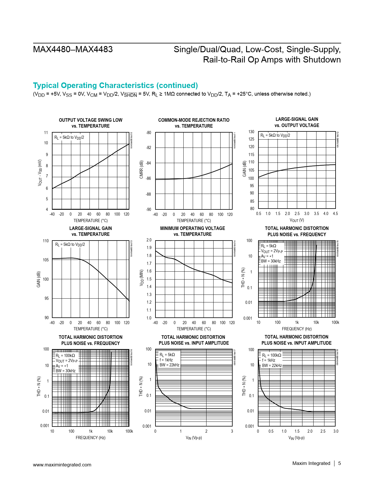 110 2.0 100 RL = 5kΩ to VDD/2 1.9 RL = 5kΩ VOUT = 2VP-P MAX4480 toc13 1.8 MAX4480 toc14 MAX4480 toc15 10 AV = +1 105 1.7 BW = 30kHz 1.6 1 100 (MIN) 1.5 GAIN (dB) V DD 1.4 THD + N (%) 0.1 1.3 95 1.2 0.01 1.1 90 1.0 0.001 -40 -20 0 20 40 60 80 100 120 -40 -20 0 20 40 60 80 100 120 10 100 1k 10k 100k TEMPERATURE (°C) TEMPERATURE (°C) FREQUENCY (Hz)