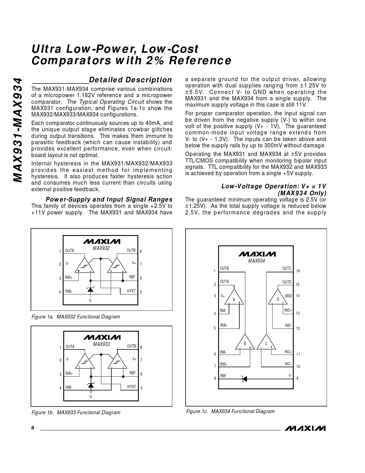 Ultra Low-Power, Low-Cost Comparators with 2% Reference_______________Detailed Description a separate ground for the output driver, allowing operation with dual supplies ranging from ±1.25V to The MAX931-MAX934 comprise various combinations ±5.5V. Connect V- to GND when operating the of a micropower 1.182V reference and a micropower MAX931 and the MAX934 from a single supply. The comparator. The Typical Operating Circuit shows the maximum supply voltage in this case is still 11V. MAX931 configuration, and Figures 1a-1c show the MAX932/MAX933/MAX934 configurations. For proper comparator operation, the input signal can be driven from the negative supply (V-) to within one Each comparator continuously sources up to 40mA, and volt of the positive supply (V+ - 1V). The guaranteed the unique output stage eliminates crowbar glitches common-mode input voltage range extends from during output transitions. This makes them immune to V- to (V+ - 1.3V). The inputs can be taken above and parasitic feedback (which can cause instability) and below the supply rails by up to 300mV without damage. provides excellent performance, even when circuit- board layout is not optimal. Operating the MAX931 and MAX934 at ±5V provides TTL/CMOS compatibility when monitoring bipolar input Internal hysteresis in the MAX931/MAX932/MAX933 signals. TTL compatibility for the MAX932 and MAX933 provides the easiest method for implementing is achieved by operation from a single +5V supply. MAX931-MAX934 hysteresis. It also produces faster hysteresis action and consumes much less current than circuits using Low-Voltage Operation: V+ = 1V external positive feedback. (MAX934 Only)Power-Supply and Input Signal Ranges The guaranteed minimum operating voltage is 2.5V (or This family of devices operates from a single +2.5V to ±1.25V). As the total supply voltage is reduced below +11V power supply. The MAX931 and MAX934 have 2.5V, the performance degrades and the supply MAX932 OUTA OUTB 1 8 MAX934 V- V+ 2 7 OUTB OUTC 1 16 INA+ REF 3 6 OUTA OUTD 2 15 INB+ HYST 4 5 3 V+ GND 14 V- A D INA- IND+ 4 13 Figure 1a. MAX932 Functional Diagram INA+ IND- 5 12 MAX933 B C OUTA OUTB 1 8 INC+ 6 INB- 11 V- V+ 2 7 INB+ INC- 7 10 INA+ REF 3 6 REF V- 8 9 INB- HYST 4 5 V- Figure 1b. MAX933 Functional Diagram Figure 1c. MAX934 Functional Diagram 8_______________________________________________________________________________________