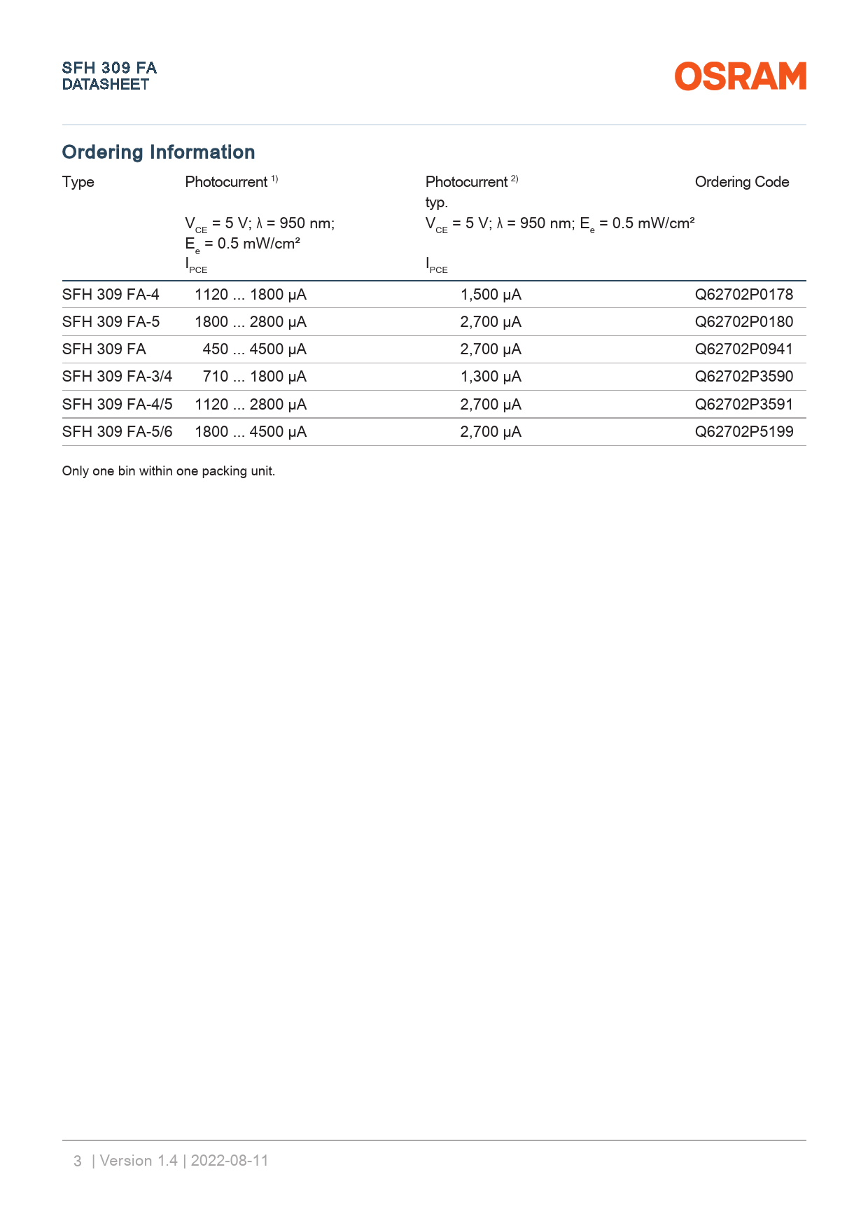 link to page 14 link to page 14 SFH 309 FA DATA A SHEET Ordering Information Type Photocurrent 1) Photocurrent 2) Ordering Code typ. V = 5 V; λ = 950 nm; V = 5 V; λ = 950 nm; E = 0.5 mW/cm² CE CE e E = 0.5 mW/cm² e I I PCE PCE SFH 309 FA-4 1120 ... 1800 µA 1,500 µA Q62702P0178 SFH 309 FA-5 1800 ... 2800 µA 2,700 µA Q62702P0180 SFH 309 FA 450 ... 4500 µA 2,700 µA Q62702P0941 SFH 309 FA-3/4 710 ... 1800 µA 1,300 µA Q62702P3590 SFH 309 FA-4/5 1120 ... 2800 µA 2,700 µA Q62702P3591 SFH 309 FA-5/6 1800 ... 4500 µA 2,700 µA Q62702P5199 Only one bin within one packing unit. 3 | Version 1.4 | 2022-08-11